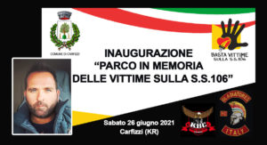 Avrà luogo il prossimo sabato, 26 giugno 2021, l’inaugurazione del “Parco in memoria delle vittime sulla S.S.106” nel Comune di Carfizzi (in provincia di Crotone). L’iniziativa, coordinata dall’Organizzazione di Volontariato “Basta Vittime Sulla Strada Statale 106”, in collaborazione con l’Amministrazione Comunale di Carfizzi vedrà anche la partecipazione del Moto Club “Krimisa Bikers Club” di Cirò Marina, del Moto Club “Gladiatores Italy” e di tanti altri bikers che arriveranno dalla Calabria.