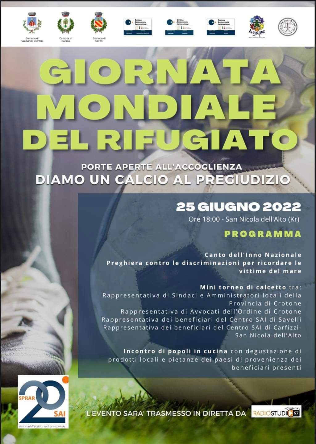 “La solidarietà è una calda coperta che riscalda il mondo dal gelo dell’indifferenza”. Con queste bellissime parole, i ragazzi hanno pubblicizzato la giornata mondiale del rifugiato il giorno 25 giugno 2022 presso il Campetto Sportivo di Via Ciuxa del paese. L’evento, seguito e narrato da Radio Studio 97, è stato inaugurato sulle note dell’inno nazionale italiano eseguito dal coro Parrocchiale e dai ragazzi. I balli del gruppo Arberesche di San Nicola dell’Alto e un commovente conclusivo momento di preghiera del Parroco Don Franco Scalise ,in ricordo delle vittime del mare hanno coronato la solennità di questo importante giornata, dedicata alla fratellanza e all’armonia dell’Universo. Al centro della giornata si è svolto un torneo di calcio a 5 cui hanno partecipato una rappresentanza di Sindaci tra i quali anche il Sindaco Francesco Scarpelli e Amministratori Locali, gli Avvocati dell’Ordine di Crotone e i ragazzi dei Centri di Accoglienza di San Nicola dell’Alto, Carfizzi e Savelli. La partita è terminata con la vittoria della squadra degli Avvocati e la premiazione da parte del Presidente della Provincia, Sergio Ferrari.