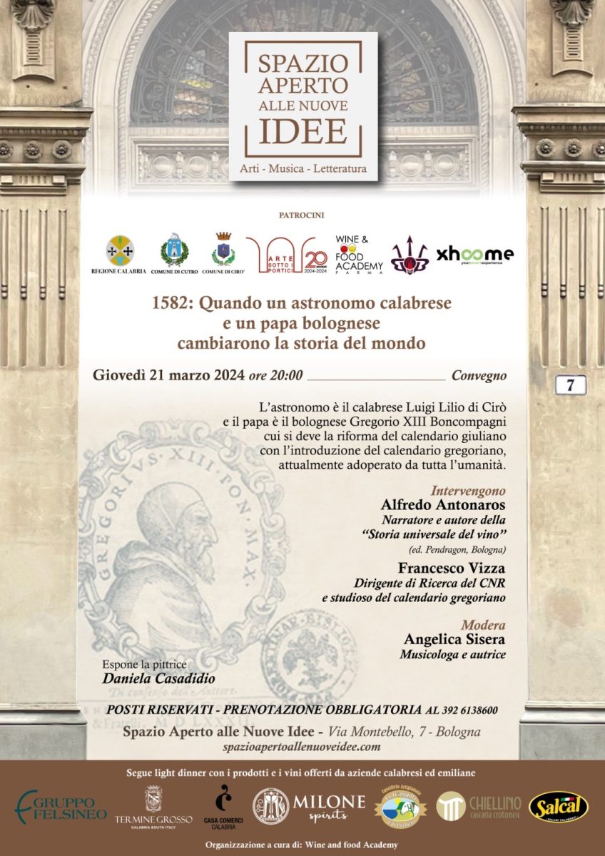 L’incontro parlerà dell’astronomo calabrese Luigi Lilio di Cirò (1510 -1576?) e del papa bolognese Ugo Boncompagni (1501-1585): proprio quel papa Gregorio XIII a cui si deve la riforma del calendario giuliano con l’introduzione del calendario gregoriano, attualmente utilizzato in quasi tutto il mondo. Nell’occasione ci sarà la presentazione di vini prodotti in regime di agricoltura biologica dell’Azienda Agricola Termine Grosso di Antonio Giglio Verga, che porta lo stesso cognome dell’astronomo calabrese Lilio. La data dell’incontro, il 21 marzo, non è affatto casuale: in occasione dell’equinozio di primavera la Regione Calabria già da tempo ha istituito la Giornata del Calendario in memoria di Luigi Lilio. La risonanza degli studi dell’astronomo calabrese sulla misurazione del tempo e sulla nostra vita quotidiana è ancora tangibile oggi grazie alla riforma del calendario, l’unico nella storia dell’umanità che riesce a sincronizzare il tempo civile con il ciclo delle stagioni.