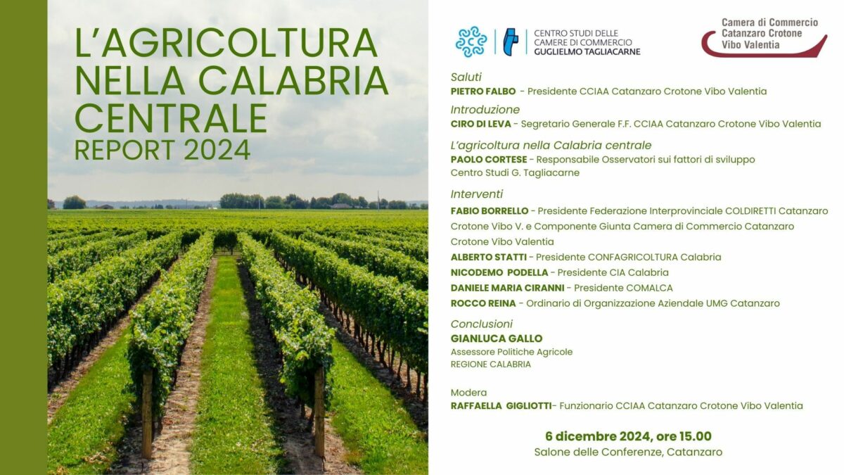 La Camera di Commercio di Catanzaro, Crotone e Vibo Valentia presenta il primo rapporto sull’agricoltura delle tre province di competenza dell’ente camerale per il 2024. La presentazione del report è prevista per martedì 6 dicembre alle ore 15.00 nella sala delle conferenze della Camera di Commercio, sede di Catanzaro in via Menniti Ippolito.