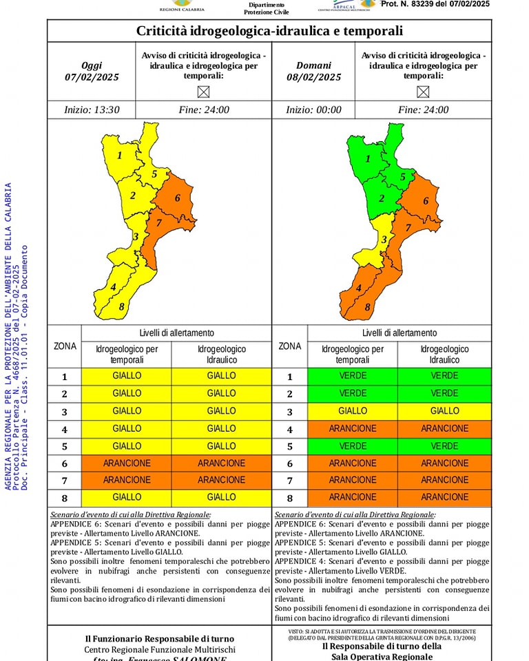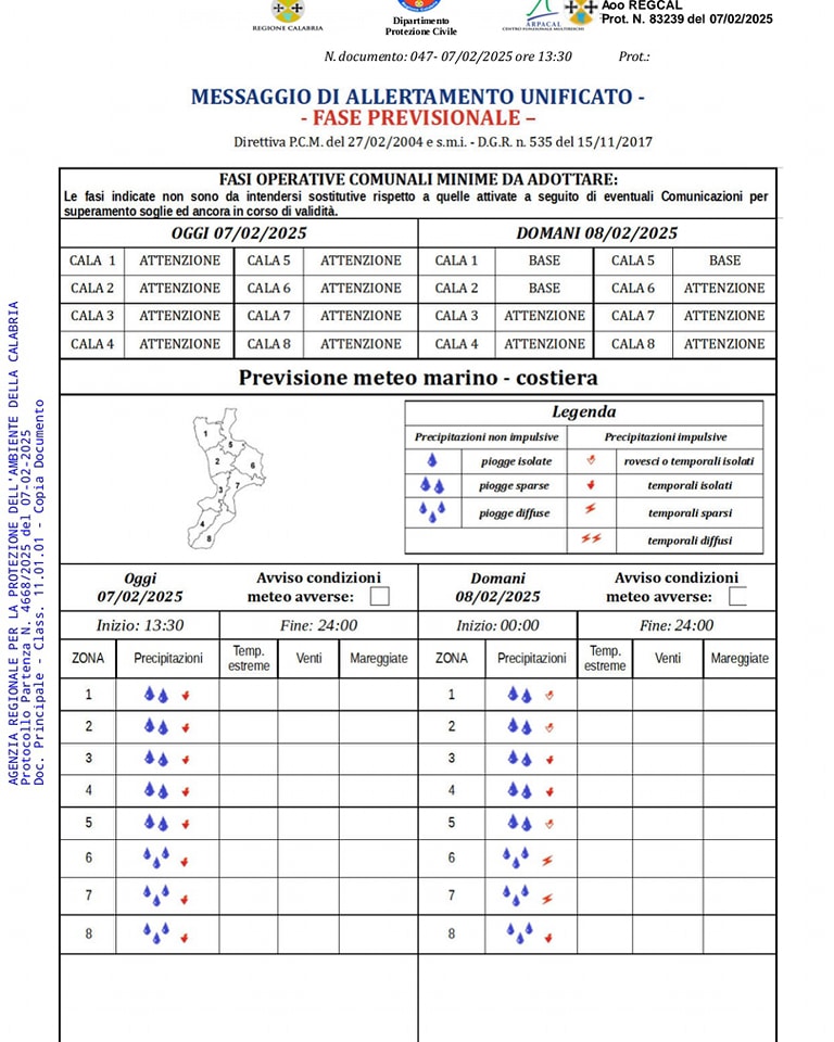 A seguito del Messaggio di Allertamento Unificato – Fase Previsionale codice ARANCIONE, emesso dalla Regione Calabria (Aoo REGCAL Prot. N. 83433 del 07/02/2025 ore 14:00 – Prot. ARPACAL 4676/2025 del 07-02-2025), che segnala la possibilità di fenomeni temporaleschi intensi, con rischio di nubifragi persistenti e potenziali esondazioni in corrispondenza dei fiumi con bacini idrografici di rilevanti dimensioni nelle zone 4, 5, 6, 7 e 8,