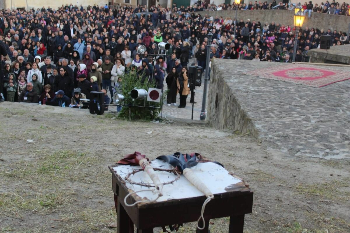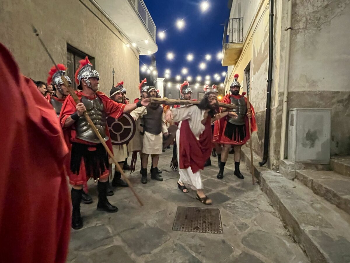 Come per incanto le fiamme hanno continuato a bruciare nei loro bracieri, mentre il pane offerto per il corpo di Cristo ha riunito il quadro dell’ultima cena. Nel Giardino degli ulivi la preghiera è salita al cielo e Gesù si è affidato al Padre con fiducia. Il bacio che l’ha condannato, poi l’arresto, la scelta di liberare Barabba, ed ancora la frusta romana che ha parlato per tutti. Dal Castello dopo aver attraversato l’intero paese si è arrivati alla Vigna del Principe, in altura, che è diventato il palcoscenico per l’intero borgo di Strongoli. La Croce poi ha suggellato l’ultimo respiro di Cristo, la morte con il suo arrivo ha invece segnato poi la vittoria della Vita nel nome dell’amore per il Padre.