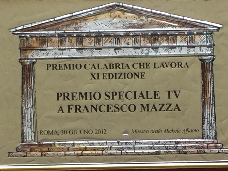 Il premio è firmato dal Maestro orafo in Crotone Michele Affidato. Il premio internazionale “Calabria che lavora” per tutti quelli che lasciano il segno. Nasce nel maggio 2002 e quindi 11a edizione e non guarda solo alla Calabria, ma a tutti i calabresi nel mondo. Mazza nel suo discorso di premiazione ha riconosciuto tutti quelli che collaborano con lui, quelli che lavorano dietro le quinte nei suoi programmi televisivi, dai cameraman a chi cura la parte tecnica, senza dimenticare amici e familiari, ed ha concluso dicendo “Amo il mondo intero, sono felice. Grazie”.