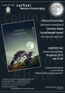 Verrà presentato domani, venerdì 10 agosto, in largo Skanderbeg, l’ultima fatica di Carmine Abate, “La collina del vento”, edito da Mondadori ed in lizza per il prestigioso Premio Campiello. Alla manifestazione, che avrà inizio alle ore 21,00, oltre all’autore saranno presenti gli amministratori comunali del piccolo centro arbereshe, un rappresentate della casa editrice Mondadori ed ‘Il parto delle nuvole pesanti’, che accompagneranno con le loro musiche, il reading dello stesso Abate. Dunque, dopo aver percorso l’Italia in lungo e in largo, Carmine Abate ed il suo romanzo, che sta riscuotendo un ottimo successo di critica e un alto indice di gradimento tra i lettori (già 23.000 le copie vendute), fanno tappa a Carfizzi, paese che ha dato i natali allo scrittore.