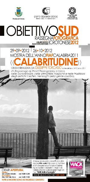 Nell’ambito della Rassegna Fotografica Crotonese 2012, “Obiettivo Sud”, ideata e curata dal Gruppo Fotoamatori Crotone e patrocinata dall’Amministrazione Provinciale di Crotone, il 29 settembre 2012, ore 18:00, presso il Mack, verrà inaugurata la mostra fotografica “Calabritudine”, alla presenza dell’autore Giuseppe Torcasio e di Attilio Lauria, docente Fiaf e redattore Fotoit. Immagini intense, quelle di Giuseppe Torcasio, che dalla superficie di una stampa penetrano immediatamente sottopelle, fino a toccare i recessi più profondi del sentire.