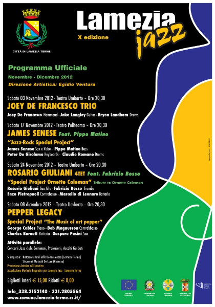 Gli appuntamenti in Jazz club sono fissati per il dopo teatro con inizio alle ore 23. Saranno Ospiti Enzo Mirabello Duo, Giorgio Caporale 4tet, ERM Trio e tantissimi altri ospiti il trombettista Rocco Riccelli e il Sassofonista Giancarlo Cuomo. Il Direttore Artistico Egidio Ventura ha dichiarato: “ La proposta, data la valenza internazionale della rassegna, consente di creare, intorno ai valori artistici proposti, condizioni di interesse e di attrattiva per il territorio, sia dal punto di vista concertistico che dal punto di vista didattico. Lamezia Jazz, giunta alla sua X edizione è riuscita a calamitare un vasto bacino d’utenza proveniente da tutta la regione, una rassegna intensa, organica e partecipata. Il cartellone è concepito non solo per gli appassionati ma anche per un pubblico meno esperto, pur salvaguardando la qualità e l’unicità dell’offerta artistica. Come nella tradizione è stato strutturato un progetto artistico particolare costruito in esclusiva per l’occasione. con lo scopo di raggiungere un pubblico eterogeneo e sensibile a progetti culturali che si caratterizzano per l’elevata carica innovativa.”