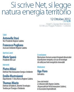 La NET Natura Energia Territorio scarl, ente gestore del Polo Innovazione sull’energie rinnovabili,efficienza energetica e tecnologie per la gestione sostenibile delle risorse ambientali della Regione Calabria per giorno12 ottobre organizza il seminario di lancio del Polo; quest’ultimo sta realizzando iniziative e progetti su ricerca industriale, sviluppo sperimentale, servizi per la ricerca e l’innovazione tecnologica sulle tematiche ambientali ed energetiche. Il Polo NET è costituito da 60 aziende calabresi e fuori Regione e Università alcune delle quali, giorno 12, presenteranno i primi impianti dimostrativi sull’energia rinnovabile.