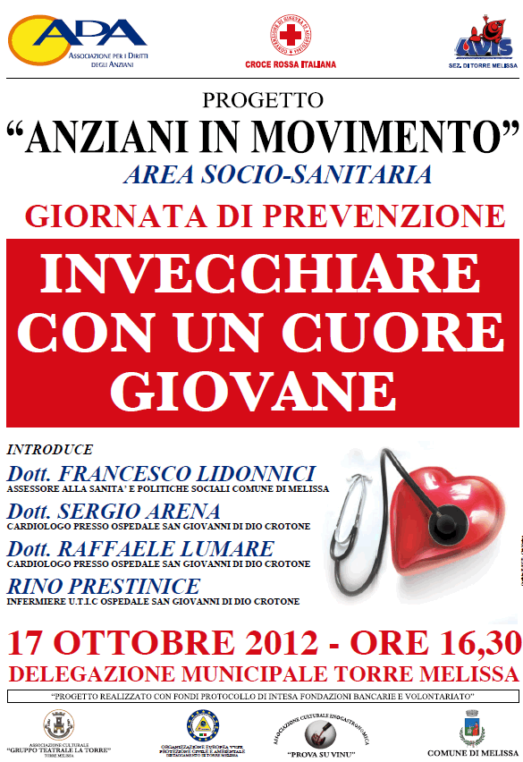 “Invecchiare con un cuore giovane” è il tema di due giornate della prevenzione degli scompensi cardiaci negli anziani organizzate dall’Area sociosanitaria del Progetto Anziani in Movimento, finanziato con fondi del Protocollo d’intesa tra Fondazioni bancarie e volontariato, nel territorio di Melissa per i giorni 17,alle 16,30 presso la Delegazione municipale di Torre Melissa, e il 24 ottobre al Centro multimediale di Melissa.
