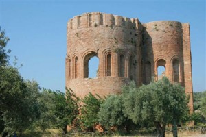 È una costruzione sacra molto singolare se non unica e i suoi giganteschi ruderi in materiale laterizio a vista segnati da una sequenza di nicchie incorniciate hanno dato la stura a diverse interpretazioni circa la datazione di fondazione: per molto tempo si è pensato all’accostamento all’architettura ravennate per poi assegnarla definitivamente alla fine del sec. XI. Sono di questo periodo anche le chiese di Santa Maria di Fontelaurato presso Fiumefreddo Bruzio (Cosenza) e il monastero di San Giovanni in Fiore in Sila che rientrano in un particolare filone dell’architettura calabrese che fu fetta anche “Florense” dal suo ispiratore Gioacchino da Fiore. Al modello latino dello stesso secolo si lega, oltre alla tanto conosciuta cattedrale di Santa Severina considerata il prototipo di questo filone, la cattedrale di San Donato di Umbriatico (Crotone), raro ed interessante esempio di edificio sacro con cripta dei primi tempi normanni: Ha un impianto planimetrico a tre navate intercomunicanti da una serie di varchi limitati lateralmente da rozzi piedritti e sovrastati da archi a sesto acuto. La parte presbiteriale è caratterizzata da quattro grandi arconi in pietrame appena sgrossato che si fronteggiano a due a due facendo ricavare uno spazio di notevole significato architettonico, e poi sostenuta da colonne a torciglione la cripta che fu l’originaria chiesa ipogea. Di questo stesso periodo e di influenza lombarda ricordiamo: la chiesa di Sant’Adriano a San Demetrio Corone (Cosenza) con grande navata a sola abside tripartita e mosaico pavimentale riproducente figure di animali e la chiesa di Santa Maria del Patir di Rossano fondata nell’ultimo decennio del sec. XI.