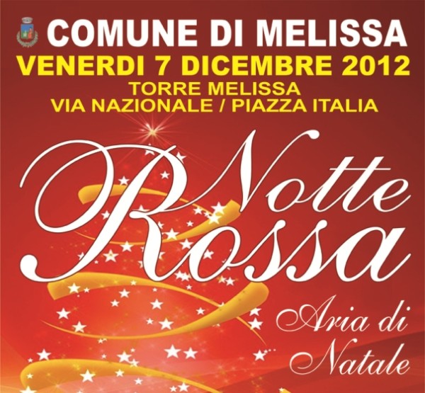Dopo il successo della Notte Rosa della scorsa estate, l’amministrazione comunale, l’assessore al turismo Dott.ssa Maria Teresa Lonetti, di comune accordo con i commercianti di Torre Melissa, hanno deciso di sfidare il periodo invernale con la realizzazione della Notte Rossa da titolo “Aria di Natale” per venerdì 7 dicembre dalle ore 18.00. Madrina d’eccezione Alessia Reda, Miss Calabria 2012. “La sfida è ardua – afferma l’assessore Lonetti – considerato che non siamo ancora sotto le festività natalizie ma la strategia utilizzata è quella di creare eventi di risonanza nei periodi di scarso flusso turistico per destagionalizzare”. Notte Rossa, notte di shopping, spettacoli tra cui i “Folletti in festa” e la “Band Palestra Show”, musica, luna park, servizio di baby parking al Marameo, attrazioni e giochi per bambini, il trenino di natale, notte ricca, con i mercatini artigianali e le degustazioni dei tipici dolci natalizi tra cui le crespelle, le pitte bone, i crustoli e le immancabili caldarroste. Grazie alla sinergia tra i commercianti, le associazioni di volontariato e l’amministrazione comunale tutto questo e molto altro sarà possibile.