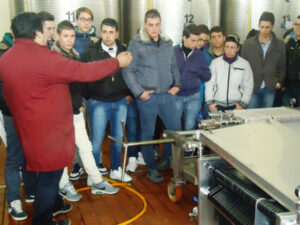 Questa reazione chimica esotermica, prosegue il tecnico- provoca un aumento della temperatura del mosto. Esiste una temperatura di vinificazione ideale per ogni tipo di vino, sia che si tratti di vino bianco, rosso, rosé, sia che abbia le peculiarità, ad esempio, di un vino liquoroso o di uno champagne, anche il controllo di questa temperatura, così come tutte le fasi che seguono sono ugualmente influenzate-precisa il tecnico dell’azienda- dalle condizioni climatiche esistenti al momento della vendemmia. Attualmente è molto utilizzato il termine termoregolazione per riferirsi al controllo della temperatura, perciò il vinicoltore è,  l’uomo-chiave in questo periodo di tempo che può variare da qualche giorno a più di una settimana in determinati casi. Per realizzare la termoregolazione, il vinicoltore deve ricorrere a due fonti di energia: L’energia calorifica- Nella produzione di vini rossi, è in effetti possibile riscaldare l’uva per avviare il processo di fermentazione. L’azione dei lieviti viene rallentata e persino bloccata ad una temperatura inferiore ai 15°C. Se si vogliono avere tutte le possibilità di raggiungere un risultato soddisfacente, la temperatura ideale deve essere di +20/+22°C. Inoltre, per alcuni tipi di vino, si rende necessario riscaldare alternativamente il succo per controllare il ciclo della fermentazione; L’energia frigorifera- L’apporto di energia frigorifera nel processo di termoregolazione, invece-  è sempre più presente nelle cantine ed è tutt’altro che raro imbattersi in impianti frigoriferi di grandi capacità nelle cantine cooperative o anche nelle aziende di dimensioni più modeste. L’energia frigorifera utilizzata varia molto, a seconda che si debba produrre un vino rosso o bianco. Questi due tipi di vino, infatti, hanno temperature di vinificazione molto diverse. Si parla allora di” fermentazione ad alta temperatura“ per i vini rossi e di “ fermentazione a bassa temperatura “ per i bianchi. Ma anche macchinari, ingranaggi, e materiali utilizzati come i filtri sono stati gli argomenti trattati. Dunque una giornata interessante  di lezioni extracurriculare  di tipo studio-lavoro ha caratterizzata la giornata  dei 50 ragazzi del biennio termico-meccanico dell’IPSIA di Crotone, accompagnati dai docenti Liguori-Tundo.