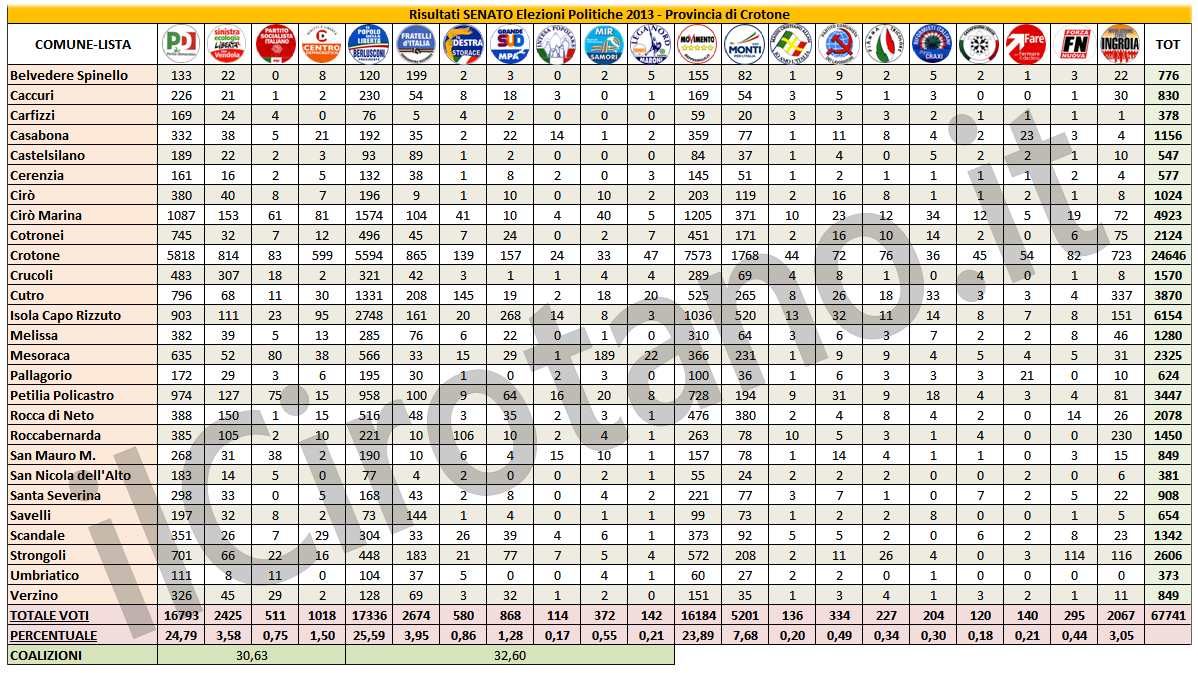 Questi i risultati al Senato delle Elezioni Politiche 2013 del 24 e 25 febbraio per quanto riguarda tutti i Comuni della Provincia di Crotone. PD: Carfizzi, Castelsilano, Cerenzia, Cirò, Cotronei, Crucoli, Melissa, Mesoraca, Petilia Policastro, Roccabernarda, San Mauro Marchesato, San Nicola dell’Alto, Santa Severina, Savelli, Strongoli, Umbriatico, Verzino; PDL: Caccuri, Cirò Marina, Cutro, Isola Capo Rizzuto, Pallagorio, Rocca di Neto; Movimento 5 Stelle: Casabona, Crotone, Scandale; Fratelli d’Italia: Belvedere Spinello.