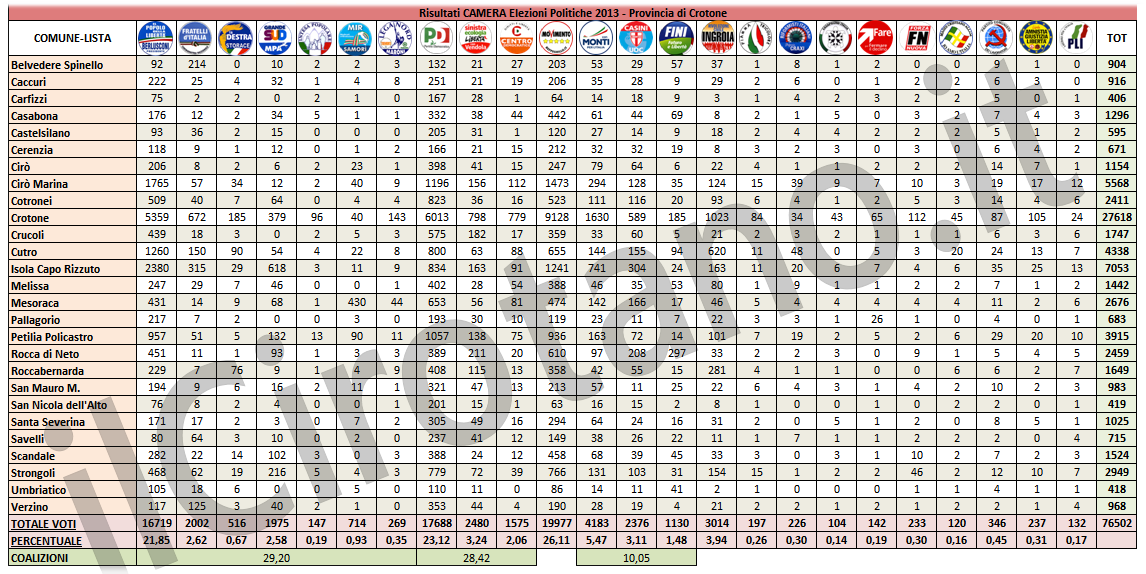 Questi i risultati alla Camera delle Elezioni Politiche 2013 del 24 e 25 febbraio per quanto riguarda tutti i Comuni della Provincia di Crotone. PD: Caccuri, Carfizzi, Castelsilano, Cirò, Cotronei, Crucoli, Melissa, Petilia Policastro, Roccabernarda, San Mauro Marchesato, San Nicola dell’Alto, Santa Severina, Savelli, Strongoli, Umbriatico, Verzino; PDL: Cirò Marina, Cutro, Isola Capo Rizzuto, Mesoraca, Pallagorio; Movimento 5 Stelle: Casabona, Cerenzia, Crotone, Scandale, Rocca di Neto; Fratelli d’Italia: Belvedere Spinello.