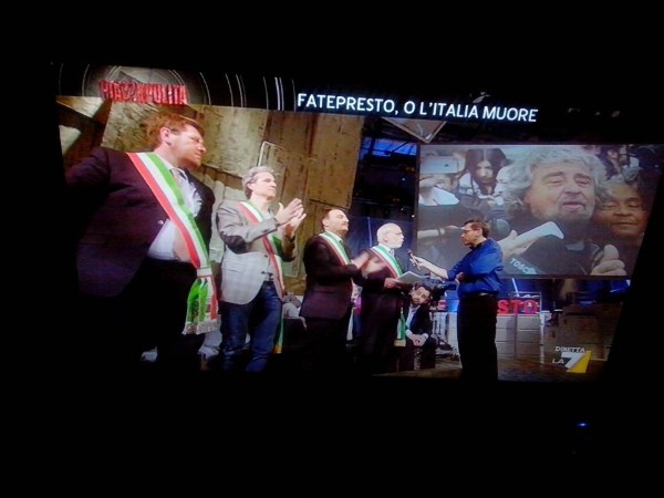 Mi considero – ha chiosato – un grillino ante literram. – Dalle critiche verso la gestione fallimentare dei rifiuti al collasso in Calabria alla rivoluzione fiscale portata avanti dal proprio comune. Anche Gagliardi, sindaco di un paese virtuoso come Saracena, con la tracciabilità telematica dei rifiuti, ha lamentato l’impossibilità dei piccoli comuni di andare avanti, sotto il peso di un patto di stabilità che, così come concepito, penalizza i comuni virtuosi, senza aiutare i viziosi. Anche noi – ha aggiunto Luigi Stasi – non rispetteremo il patto di stabilità. Ci sono cittadini e famiglie ormai sul lastrico. Non riusciamo a garantire i servizi di base. Ecco perché non possiamo e non dobbiamo passare altri 20 anni a sentire parlare solo dei politici nel talk show, basta! Dobbiamo parlare dei bisogni reali della società. Ed anche Grillo si metta in testa che questa nazione va governata. Se il M5S si è candidato deve andare in Parlamento e dire quello che vuole fare. Devono dirlo anzi tutto a noi sindaci, ultimo baluardo democratico. L’hashtag #FatePrestoPerchè, nel frattempo ha scatenato i commenti dei telespettatori, solidali con i protagonisti di alcuni servizi, critici con i politici o con gli interventi degli ospiti in studio. Da Daniela Santanchè del PDL a Matteo Richetti del PD, da Peter Gomez direttore de I l Fatto Quotidiano, a Jhon Hooper giornalista di THE Guardian, da Alberto Forchielli dell’osservatorio Asia fino all’imprenditore Ernesto Preatoni. – Lo stesso Formigli, a fine trasmissione, si è congratulato con Stasi e Gagliardi: siete rimasti voi sindaci – ha detto – a difendere dal basso l’esigenza di un rinnovamento reale di questo Paese!