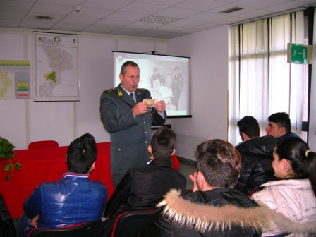 Tale iniziativa, assunta a livello centrale tra il Comando Generale della Guardia di Finanza e il Ministero dell’Istruzione, dell’Università e della Ricerca -MIUR-, è stata finalizzata a promuovere, nell’ambito dell’insegnamento “Cittadinanza e Costituzione”, un programma di attività a favore degli studenti della Scuola Primaria e Secondaria, in cui, non è stata solo rappresentata l’attività del Corpo a contrasto degli illeciti fiscali, nelle falsificazioni, contraffazioni e violazioni dei diritti d’autore nonché nell’uso e spaccio di sostanza stupefacenti, ma si è voluto porre l’accento e “seminare” la consapevolezza del valore della “legalità economica” e la diretta connessione all’esercizio di una cittadinanza attiva e responsabile, quale fondamentale momento di passaggio per una crescita collettiva più giusta. Nell’occasione quindi non sono stati i Finanzieri a visitare la Scuola, ma gli studenti a recarsi direttamente presso una struttura militare presidio di legalità che, accompagnati da due loro docenti i Proff. Giuseppina Davoli e Saverio Masseria, hanno dimostrato,nei momenti dedicati al confronto, un livello di attenzione non comune. Molto proficuo si è rivelato l’utilizzo di metodologie d’interazione multimediali e la proiezione di filmati che hanno stimolato il confronto. La comunicazione è stata tutt’altro che cattedratica, ma di tipo “circolare”, adeguata all’età degli studenti ed informata a criteri di interattività; è stato un autentico momento di scambio e crescita reciproca tra le parti in azione. L’interazione non è stata monopolizzata dal relatore principale, ma gli studenti hanno potuto confrontarsi anche con i Finanzieri delle principali componenti specialistiche del Corpo“aeronavale”: elicotterista, sommozzatore ecomponente di equipaggio di un’unità navale. Il progetto è abbinato ad un concorso nazionale, denominato “Insieme per la legalità”, che vuol sensibilizzare i giovani, attraverso una libera e creativa rappresentazione grafico-pittorica o una produzione video-fotografica, sulle tematiche trattate. Il bando relativo al concorso, la cui scadenza per la presentazione dei lavori è stata fissata al 30 aprile 2013, è disponibile sui rispettivi siti internet istituzionali: www.istruzione.it e www.gdf.gov.it