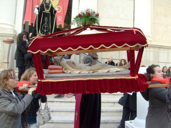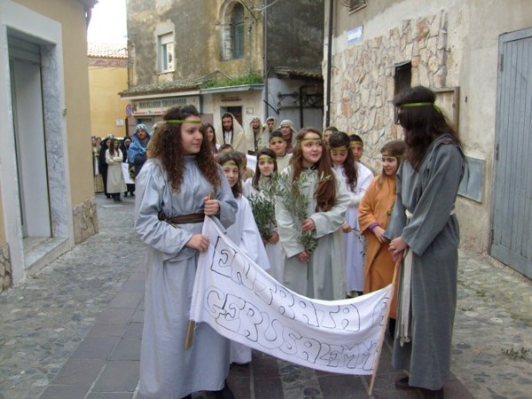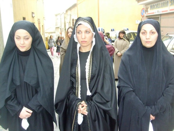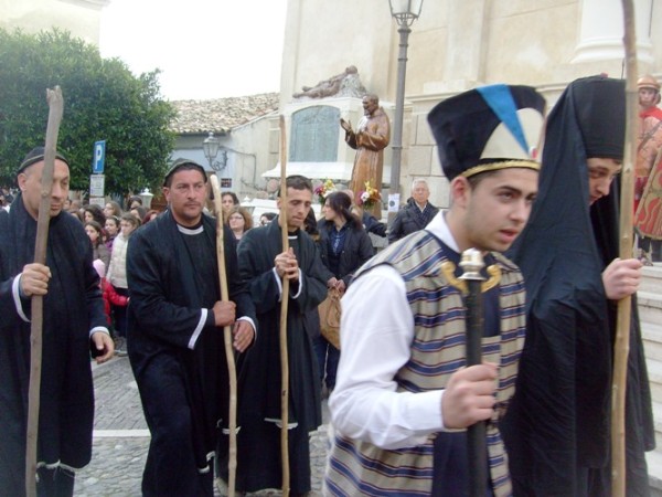 Anticamente la processione della passione di Cristo veniva fatta il Sabato santo, veniva portato per le vie del paese il santo sepolcro detto “ U Suburcu”, più precisamente “A Naca”, la statua di Maria Addolorata, seguiti da antiche preghiere. Sono moltissimi i fedeli che animavano la processione, tra di loro i “Frateddi”, che erano un gruppo di accompagnatori presenti in ogni processione. Questi appartenevano a due chiese diverse: quelli con la tunica bianca e il mantello rosso chiamati la “Mazzetta”, facevano capo alla chiesa di Santa Maria De Plateis, in Piazza Pugliese; Quelli invece con la tunica bianca e il mantello nero facevano capo alla chiesa di San Menna, situata nel centro storico. Uno dei “Frateddi” aveva il compito di stare in avanti la processione, poiché doveva portare una grande bandiera nera, in segno di lutto, chiamata “U Stinnardu”. Dei “Frateddi” oggi purtroppo rimane solo un lontano ricordo, nessuno più ne fa parte. Attualmente rimane solo un fedele che per voto impersona Gesù nella via Crucis, portando la croce durante la processione, che di tutte rimane la più sentita dai fedeli per passione e religiosità. E ancora, era antica tradizione che,durante il sabato santo, si cantasse e pregasse per avere un buon raccolto mentre ci si accingeva a chiedere nel vicinato alcuni dolci tipici come le cozzupe e i mucceddati. In questo periodo, si chiedevano grazie, per esempio chi desiderava ricevere qualche grazia doveva osservare un particolare rito, ancora oggi tramandato dagli anziani: si doveva bussare all’esterno della propria abitazione dicendo”Maria, Maria, bona nova portu a ttia, grazia tu concedi a mmia, tuo figlio è resuscitato io voglio essere pagato”(Maria, Maria,buone notizie io porto a te, grazia tu concedi a me, tuo figlio è risorto, io voglio essere pagato). Alla fine si poggiava l’orecchio alla porta per sentire voci, rumori, o echi che assicurassero che la grazia era stata concessa. Dopo la Pasqua ogni famiglia va nelle campagne a festeggiare “u Pascono”(la Pasquetta), generalmente sotto un grande albero dove si può fare l’altalena e si può mangiare i piatti tipici caserecci come il capretto e la peperonata accompagnata da salsicce, soppressate, sardella e pane fatto in casa, il tutto bagnato da un buon bicchiere di vino rosso del Brigante, o di Carroccedda, o di Santa Venere, o del Feudo, e come dolce la classica cozzupa. Secondo l’antica tradizione l’altalena veniva fatta per simboleggiare la vicinanza dell’uomo con il cielo, ecco perché si fa proprio in occasione della Pasqua. Inoltre per far rivivere alcune antiche tradizioni sulla Pasqua in ogni chiesa, gruppi di fedeli hanno allestito i sepolcri corredati da i “Laureddi” semi di cereali e legumi fatti germogliare durante la quaresima completamente al buio, come vuole la tradizione, che la popolazione ha poi visitato durante la notte, dopo la messa dedicata alla Madonna.