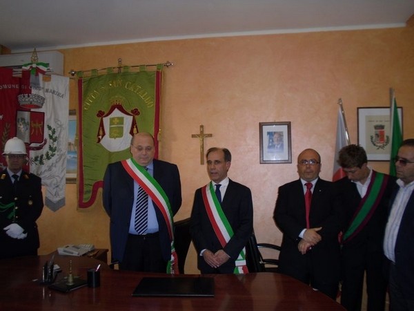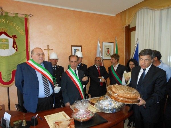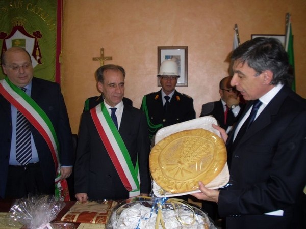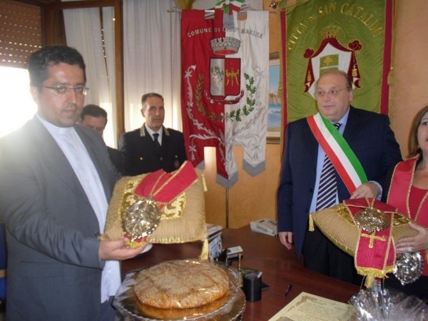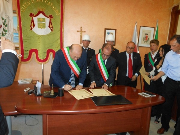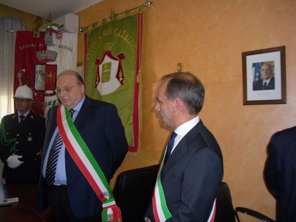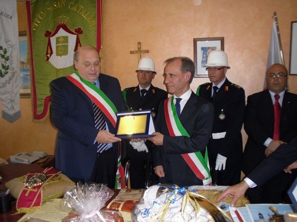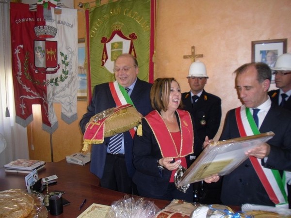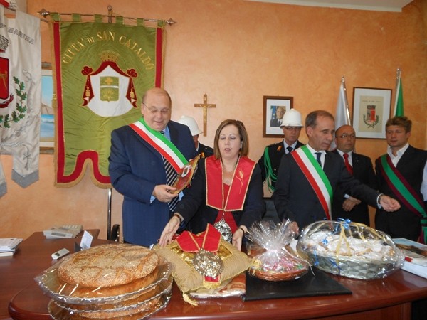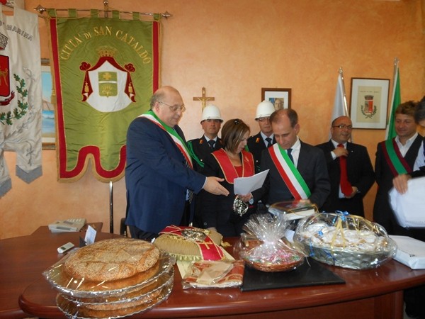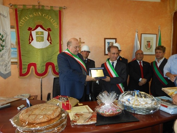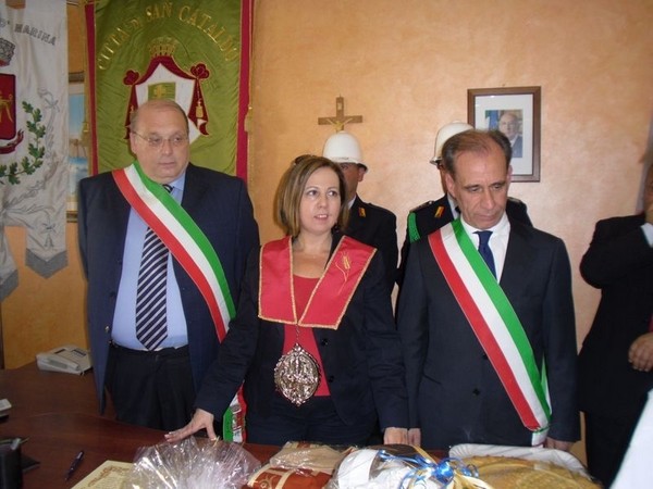 Le massime autorità del Comune di San Cataldo, in Sicilia, hanno sancito, con una articolata cerimonia significativa e ricca di simbologie cristiane e civili, il loro gemellaggio con il Comune di Cirò Marina. Mercoledì 8 maggio, ricevuti dal Sindaco, Roberto Siciliani e da alcuni componenti la giunta, fra i quali l’assessore alla cultura, Sergio Ferrari, presso la sala dello stesso primo cittadino, Francesco Raimondi, sindaco di San Cataldo, accompagnato per l’occasione dal presidente del Consiglio della stessa città siciliana, Cristofaro Amico, dall’assessore alla cultura, Giuseppe Ansalone e dal corpo della polizia Municipale con in testa lo stesso comandante, hanno dato vita allo scambio dei gonfaloni e al rituale protocollo che, una volta sottoscritto, ha di fatto sancito il legame fra queste due comunità, entrambi devote al Santo patrono, San Cataldo Vescovo. Una fede e un amore per questo Santo che da pochi giorni lega non solo Cirò Marina con San Cataldo, ma anche con Supino, gemellaggio avvenuto nel 2007 e che rafforza e conferma l’amore e la fede per San Cataldo, quale valore irrinunciabile. Dopo le reciproche parole di ringraziamento e solidale affermazione verso il raggiungimento di più larghe e coinvolgenti manifestazioni di scambi culturali, storici e religiosi, le due comunità si sono strette più significativamente intorno ai valori di fede che questo santo rappresenta. A testimoniare questi valori, il decano della chiesa locale, Mons. Antonino Terminelli, don Gianni Filippelli, parroco della parrocchia di San Cataldo e l’artefice di questo gemellaggio, Caterina Amodeo. Con una cerimonia nella cerimonia infatti, la stessa nostra concittadina, è stata nominata dal presidente della confraternita di San Cataldo, socio onorario dello stesso comitato siculo, delegandola a rappresentare la confraternita sia presso la comunità di Cirò Marina che di Supino consegnandole, la stola della congregazione, poi consegnata anche formalmente al Sindaco, Roberto Siciliani e a don Gianni Filippelli.