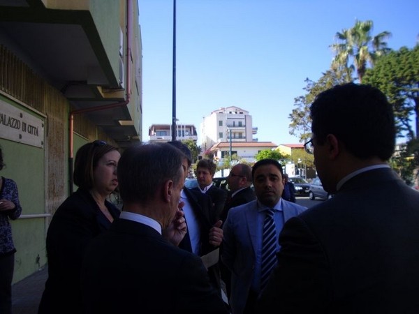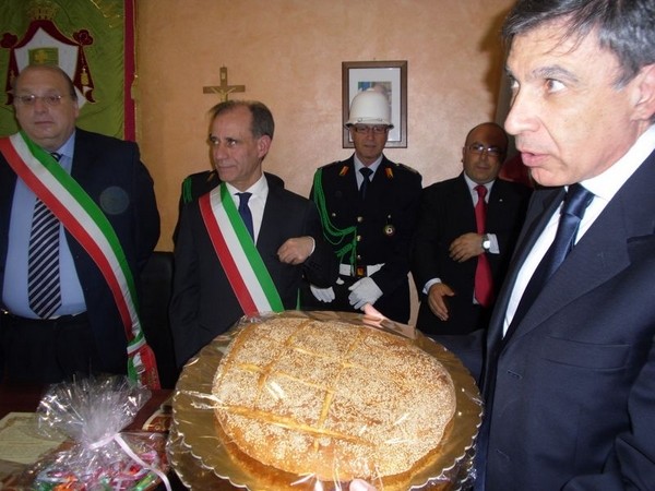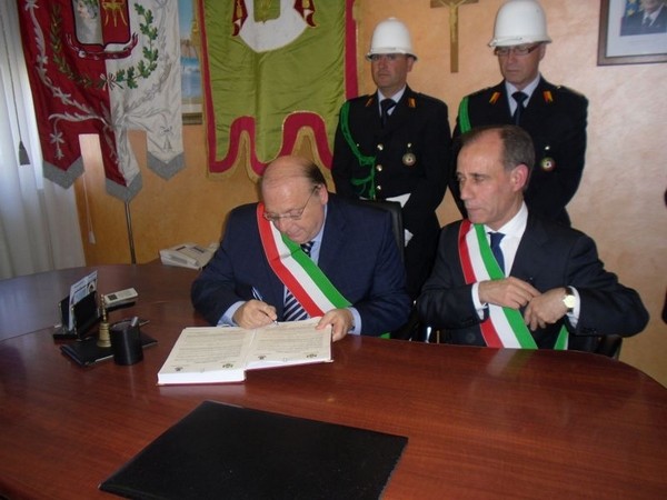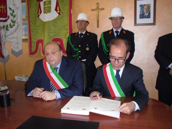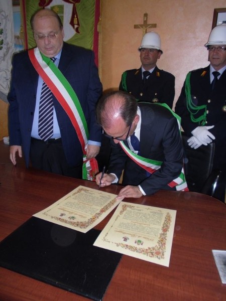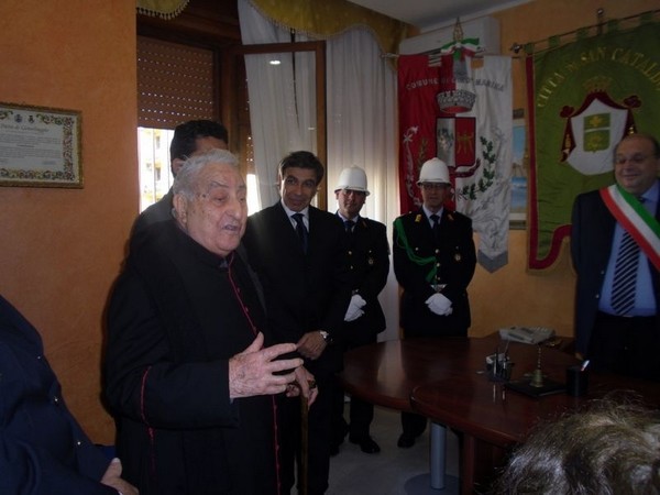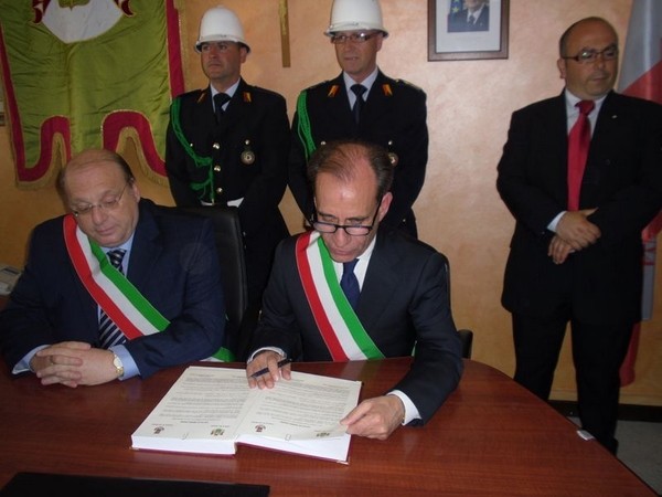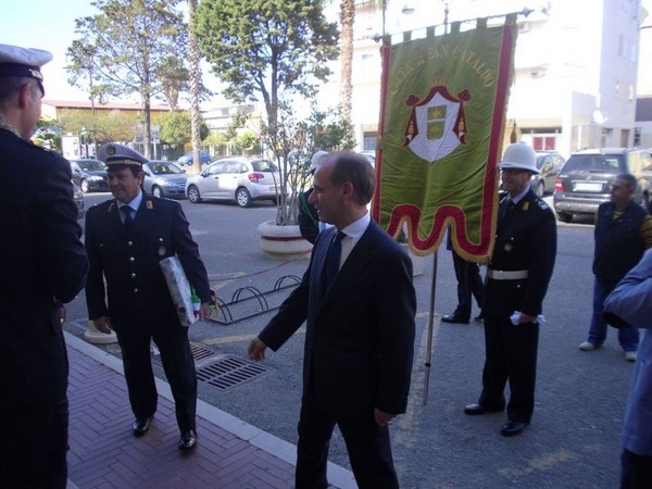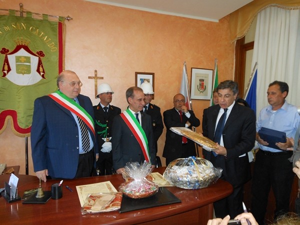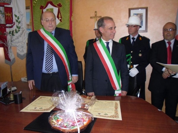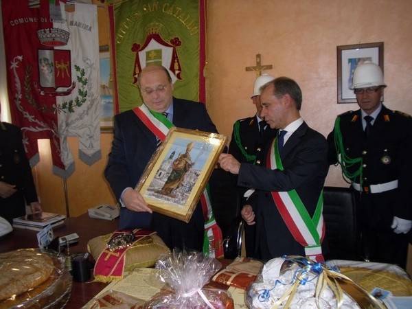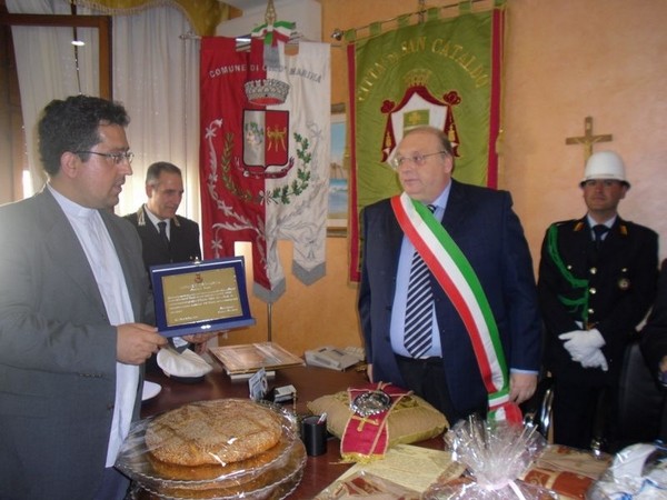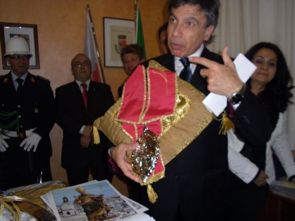 Le massime autorità del Comune di San Cataldo, in Sicilia, hanno sancito, con una articolata cerimonia significativa e ricca di simbologie cristiane e civili, il loro gemellaggio con il Comune di Cirò Marina. Mercoledì 8 maggio, ricevuti dal Sindaco, Roberto Siciliani e da alcuni componenti la giunta, fra i quali l’assessore alla cultura, Sergio Ferrari, presso la sala dello stesso primo cittadino, Francesco Raimondi, sindaco di San Cataldo, accompagnato per l’occasione dal presidente del Consiglio della stessa città siciliana, Cristofaro Amico, dall’assessore alla cultura, Giuseppe Ansalone e dal corpo della polizia Municipale con in testa lo stesso comandante, hanno dato vita allo scambio dei gonfaloni e al rituale protocollo che, una volta sottoscritto, ha di fatto sancito il legame fra queste due comunità, entrambi devote al Santo patrono, San Cataldo Vescovo. Una fede e un amore per questo Santo che da pochi giorni lega non solo Cirò Marina con San Cataldo, ma anche con Supino, gemellaggio avvenuto nel 2007 e che rafforza e conferma l’amore e la fede per San Cataldo, quale valore irrinunciabile. Dopo le reciproche parole di ringraziamento e solidale affermazione verso il raggiungimento di più larghe e coinvolgenti manifestazioni di scambi culturali, storici e religiosi, le due comunità si sono strette più significativamente intorno ai valori di fede che questo santo rappresenta. A testimoniare questi valori, il decano della chiesa locale, Mons. Antonino Terminelli, don Gianni Filippelli, parroco della parrocchia di San Cataldo e l’artefice di questo gemellaggio, Caterina Amodeo. Con una cerimonia nella cerimonia infatti, la stessa nostra concittadina, è stata nominata dal presidente della confraternita di San Cataldo, socio onorario dello stesso comitato siculo, delegandola a rappresentare la confraternita sia presso la comunità di Cirò Marina che di Supino consegnandole, la stola della congregazione, poi consegnata anche formalmente al Sindaco, Roberto Siciliani e a don Gianni Filippelli.
