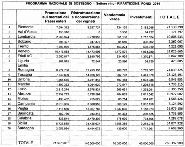 Nell’ambito del Programma Nazionale di Sostegno al settore vitivinicolo, il Ministero delle politiche agricole, alimentari e forestali, con decreto del 21 maggio 2013, in corso di pubblicazione in Gazzetta Ufficiale, ha stabilito la ripartizione della dotazione finanziaria relativa all’anno 2014. Lo stanziamento previsto per l’anno 2014 dall’OCM (organizzazione comune dei mercati), settore vino, è di 333.997.000 euro, da dividere tra le regione. In particolare per la Calabria sono stati stanziati 4.282.078 di euro di cui: 833.544 per promozione sui mercati dei Paesi esteri; 2.479.309 per ristrutturazione e riconversione dei vigneti; 175.620 per la Vendemmia verde; 793.605 per investimenti. Nell’immagine sotto l’elenco della ripartizione fondi 2014 del settore vino per tutte le regioni italiane.