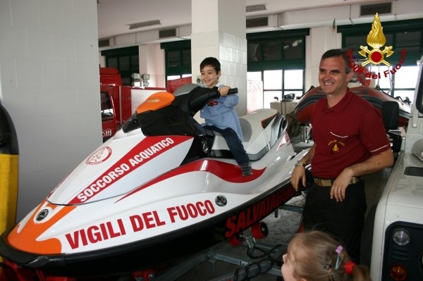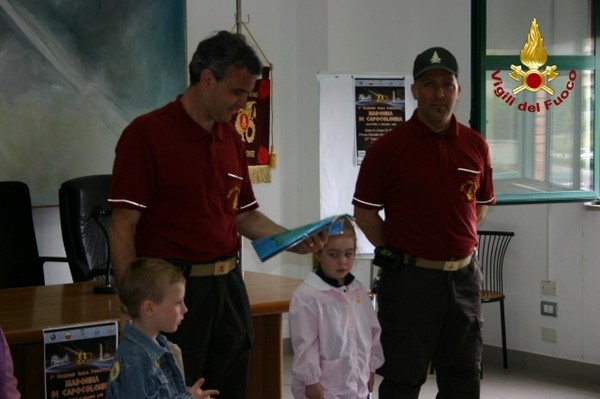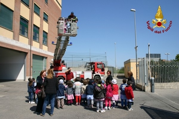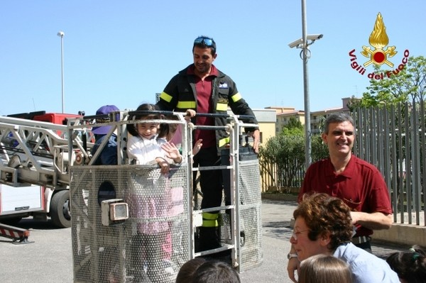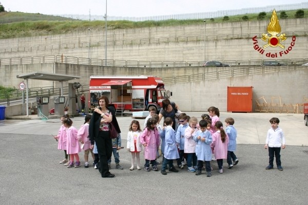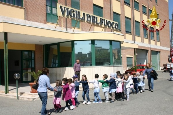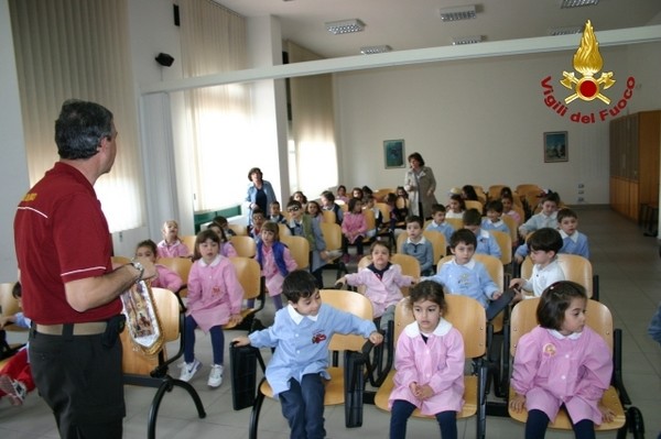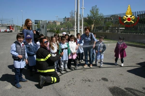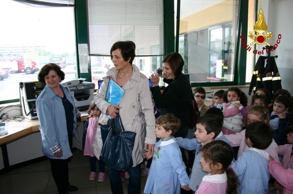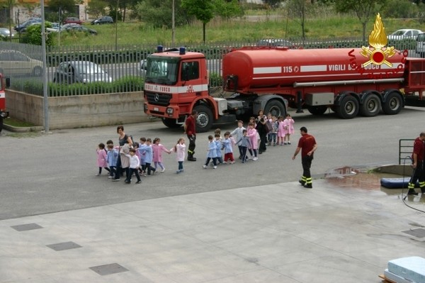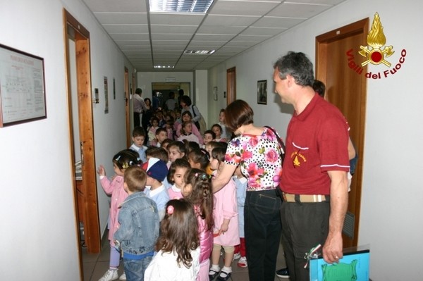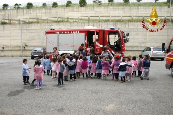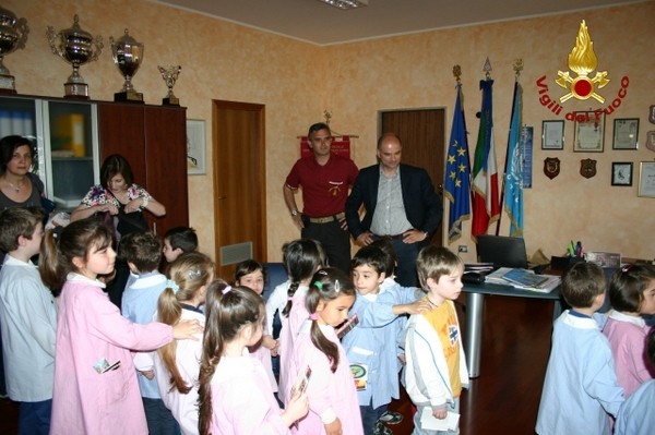 All’interno del percorso di crescita dei bambini dai tre ai sei anni, la scuola e la famiglia hanno il compito di educare alla sicurezza rendendo i luoghi di vita più sicuri, informando e facendo conoscere cosa ogni individuo, piccolo o grande che sia, può e deve fare. Affascinati dalla figura del vigile del fuoco, a conclusione di tale percorso, i bambini accompagnati dalle maestre hanno fatto visita ai vigili, consegnando un libro-dono che hanno realizzato con i loro disegni. Entusiasti della visita, le maestre hanno inviato una lettera di ringraziamento al comando dei vigili dicendo: ” …con amorevole pazienza i VVF hanno guidato i bambini nei diversi ambienti della caserma spiegando loro con linguaggio semplice e chiaro l’importanza del loro servizio. Molto entusiasmante è stata la simulazione di un intervento durante il quale i bambini hanno fatto un breve percorso sull’autopompa e con l’aiuto dei vigili hanno usato la pompa per spegnere un fuoco immaginario…”.