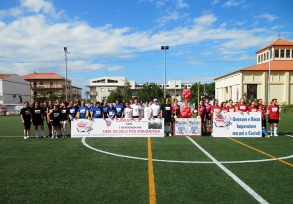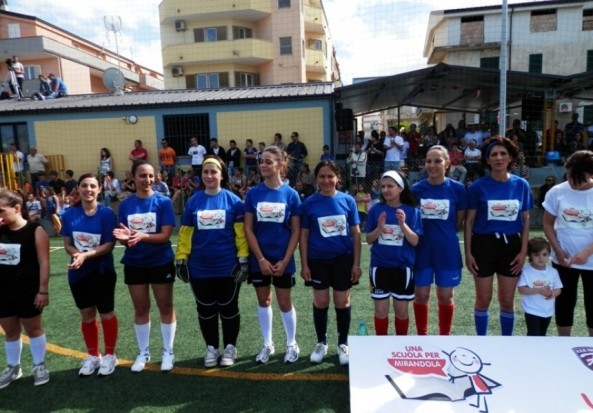 di Ignazio Russo. E’ stata organizzata una bella manifestazione sportiva dilettantistica, di calcio femminile, domenica scorsa a Cariati, al Centro Sportivo il “Ragno”, per la raccolta di fondi a favore dell’associazione “Una Scuola per Mirandola”, la cittadina modenese colpita duramente dal terremoto nel maggio dell’anno scorso. La manifestazione, organizzata dai responsabili del Centro Sportivo: Pino Greco, Giovanni Greco, Gina Mussuto e Stefania Morelli, ha visto la partecipazione di quattro squadre al torneo di calcio femminile – la partita del cuore-. All’evento sportivo era presente Domenico Maietta il calciatore dell’Hellas Verona, neo promosso in serie A, originario di Cirò Marina e il responsabile dell’Associazione Italiana Arbitri di Rossano Antonio Celestino.