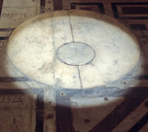 Lo gnomone è di solito un palo, una colonna o un obelisco la cui ombra permette di misurare la posizione del Sole in cielo, ma può anche essere, come in questo caso, un foro praticato sulla cupola del Duomo che produce, per effetto stenopeico, l’immagine del disco solare. Questa, in maniera simile all’ombra del vertice di un obelisco, si muove continuamente da ovest verso est, a causa del moto apparente del Sole. La sua posizione rispetto ad opportuni riferimenti posti sul pavimento permette di seguire accurate misurazioni astronomiche, così che questo tipo di strumento, pur di semplice concezione, è rimasto in uso fino al XVIII secolo. Grazie allo gnomone, ha spiegato Mazzoni, si può confrontare con precisione la posizione dell’immagine del sole a distanza di un anno civile e quindi determinare al meglio la durata dell’anno tropico. Si intende per anno tropico l’intervallo medio tra due passaggi consecutivi del Sole apparente per l’equinozio di primavera. Il momento scelto per confrontare le immagini può anche essere quello del solstizio estivo perché era supposto che garantisse misurazioni più affidabili.