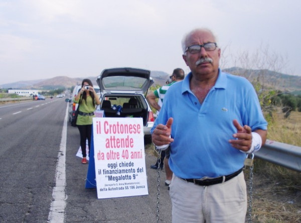 Di nuovo in catene sulla statale 106. Così Nando Amoruso, presidente del movimento Vita (Viabilità, infrastrutture, trasporti, ambiente) ha voluto sollecitare, ancora una volta l’Anas, ad effettuare i lavori di messa in sicurezza della statale 106 nel tratto tra Crotone e Sibari. Con Amoruso, alla manifestazione del 20 luglio, c’erano molti cittadini, rappresentanti sindacali, ed i sindaci dei comuni di Cirò Marina, Umbriatico, Crucoli. In catene sul tratto rettilineo della SS106 nei pressi dello svincolo di Cirò Marna, Amoruso ha ribadito il mancato inizio dei lavori nel tratto che va dall’aeroporto di Crotone a località Zolfara di Rossano sottolineando le mancanze dell’Anas in tutti questi anni e l’assegnazione di lavori con eccessivi ribassi che, secondo il presidente del movimento Vita, per questo non vedranno mai la luce.