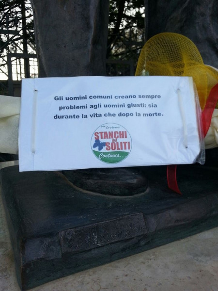 “Difendere Crotone e le personalità a essa legate è alla base dei valori del nostro movimento politico. Rino Gaetano è una di tali personalità, pertanto è d’obbligo manifestare il nostro sdegno per il maschino gesto verificatosi nei giorni scorsi al Verano – afferma Andrea Arcuri del movimento “Stanchi dei Soliti”. Abbiamo deciso di deporre un mazzo di fiori ai piedi della statua di Rino situata sul lungomare di Crotone; fiori che, molto probabilmente, saranno rimossi da qualche incivile nei prossimi giorni. Tra l’altro, non sono pochi coloro che disprezzano Rino Gaetano perché tanti anni fa- stando alle voci di popolo- pare abbia screditato gli abitanti della nostra città. Beh, qualora ciò fosse vero, va ricordato che è in perfetta sintonia con quello che avviene quotidianamente a Crotone: tanti crotonesi sparlano del “Crotonese” come se fosse un’entità a sé stante, i cui tratti tipici divulgati sono l’invidia, la presunzione e i pettegolezzi. Dimenticando totalmente, invece, che i “Crotonesi” siamo tutti noi. Noi consideriamo Rino Gaetano un uomo giusto poiché privo d’omertà e disposto a denunciare le brutture del mondo in cui viviamo. Denunce che, secondo alcuni scrittori qualificati, ne hanno ostacolato il ricovero in quella notte del suo incidente stradale. Per tali ragioni, oltre a deporre i fiori, di fianco alla sua statua abbiamo sistemato una targa con su scritto: “Gli uomini comuni creano sempre problemi agli uomini giusti: sia durante la vita che dopo la morte.”
