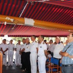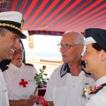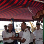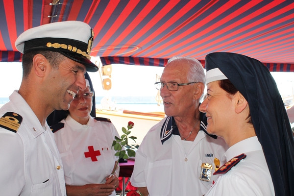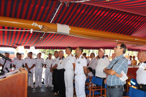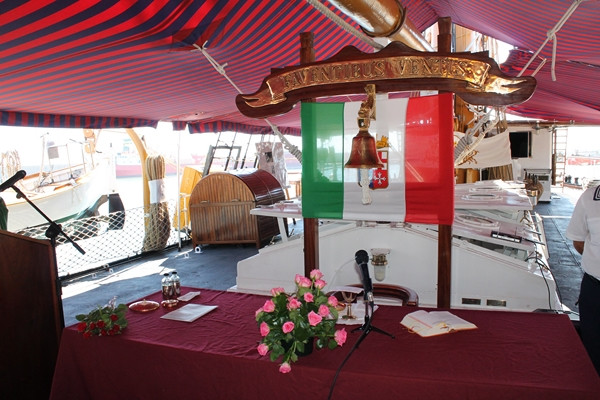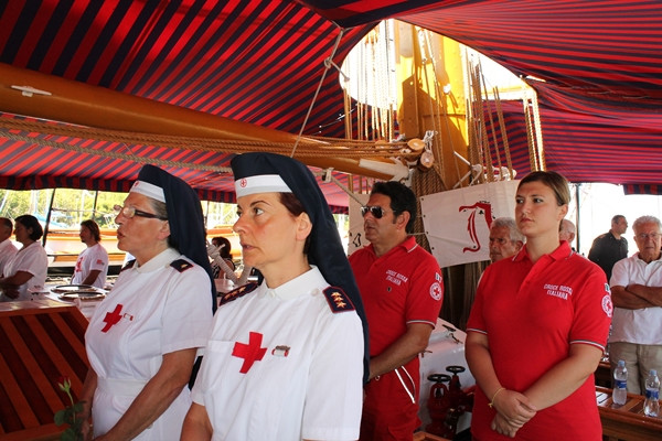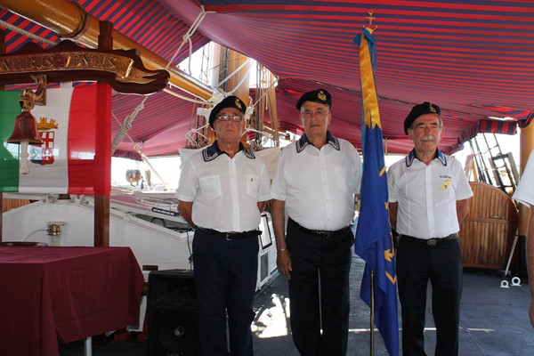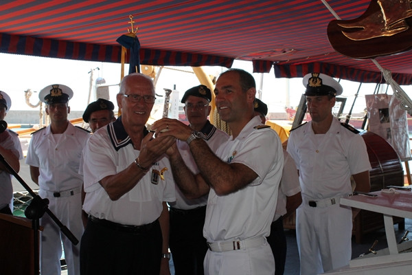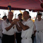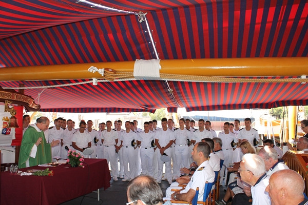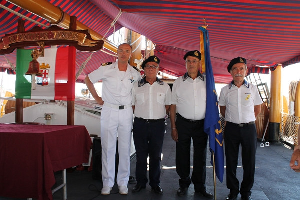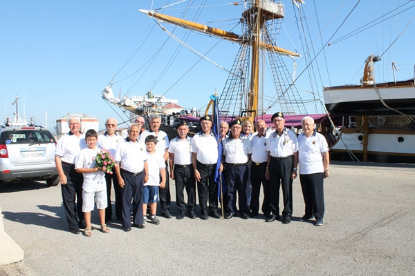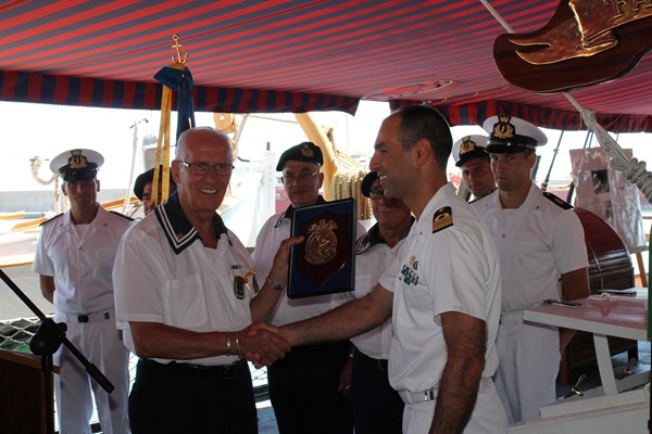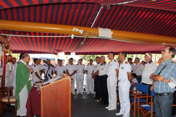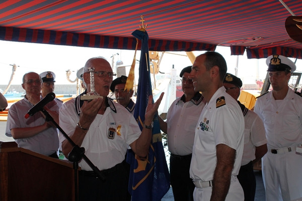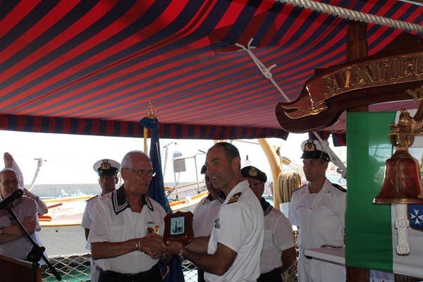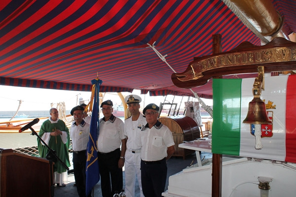 Domenica 4 agosto, in occasione della venuta a Crotone della Nave Scuola della Marina Militare “Palinuro”, si è tenuta a bordo una Santa Messa. Al rito, officiato da Mons. Ezio Limina, hanno partecipato i Soci del Gruppo ANMI di Crotone e della Sezione aggregata di Cirò Marina, militari della Guardia Costiera, rappresentanti del Corpo militare della Croce Rossa Italiana e l’equipaggio della Nave. Erano presenti alla funzione religiosa il Comandante della Capitaneria di porto di Crotone, Capitano di vascello Antonio Ranieri, il Comandante del “Palinuro”, Capitano di fregata Mauro Panarello, e il Presidente del Gruppo ANMI di Crotone, Salvatore Zito. Dopo la Santa Messa il Presidente Zito ha ringraziato i Comandanti Ranieri e Panarello per aver donato a tutti i presenti una giornata meravigliosa, arricchita dalla possibilità di visitare la Nave in tutti i suoi particolari e di familiarizzare col suo equipaggio. In segno di riconoscenza Zito ha donato al Comandante Panarello la colonna di Capo Colonna in argento creata dal Maestro Orafo Michele Affidato.