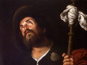 Nel medioevo molti si mettevano in viaggio entrando nella dimensione dell’ “homo viator”. Lasciavano famiglia ed averi, facevano testamento e partivano. Roma era una delle mete allora più frequentate a causa delle alterne vicende di Santiago e Gerusalemme minacciate o in mano agli Arabi. Vescovi e Abati che si recavano dal Papa erano viaggiatori abituali sulla Via. Se ne servirono anche i Crociati che nell’XI sec. Si recarono alla conquista del Santo Sepolcro. Il movimento sulla Francigena non si fermò mai del tutto, raggiungendo le sue punte maggiori durante gli Anni Giubilari: basti pensare all’enorme afflusso per il primo Giubileo della storia, quello del 1300. Tornando a san Rocco, è proprio nella città emiliana di Piacenza che si ammala di peste e, nelle sue vicinanze, guarisce. Rocco era nato tra il 1345 e il 1350 da una ricca famiglia di Montpellier, città della Linguadoca, sede vescovile, importante per l’antica università ed il commercio marittimo. Dopo aver assistito alle terribili pestilenze del 1348 e del 1361, a vent’anni lascia la città natale ed ogni suo avere. Si porta verso l’Italia attraverso i vecchi sentieri della Gallia Cisalpina, l’Emilia e l’Umbria, soccorrendo ammalati ed appestati negli ospedali come negli ospizi. Nel 1368 lo troviamo a Roma, dove cura e guarisce miracolosamente dalla peste, che allora infuriava, molti personaggi anche illustri e un prelato. Nel viaggio di ritorno a Piacenza, nel 1371 si ammala di peste. Il doloroso bubbone all’inguine lo spinge nei boschi di Sarmato dove viene salvato dalla fame da un cane che gli porta ogni giorno una pagnotta. Rocco guarisce, continua a far miracoli e seguaci, sino alla morte tra il 1376 e il 1379 a Voghera, incarcerato come spia per non aver voluto svelare la propria identità, grazie ad un voto di anonimato. Un angelo lo avverte della morte e lui se ne va col volto raggiante. Una vita come tante, forse, tra realtà e fantasia. Ma negli ultimi anni del ‘400 il rinnovarsi della peste in tutta Europa ed anche in Italia, con episodi continui nei due secoli seguenti, stimola alcuni studiosi e biografi, come Domenico da Vicenza e Francesco Diedo, a scrivere l’agiografia di san Rocco. Nasce così una particolare iconografia del Santo, che lo raffigura come un giovane barbuto, vestito col mantello da pellegrino “il sanrocchino”, cappello a larghe falde, bastone, stivali e la famosa piaga, trasferita per pudore, dall’inguine alla coscia. E con lui, vengono descritti, di volta in volta, l’angelo, il cane, le conchiglie dei pellegrini e tutti gli attributi tipici del pio viandante. In quei due secoli è un vero e proprio boom di immagini, richieste da committenti privati, confraternite ed ordini religiosi vari. Sono tanti gli artisti, grandi e meno talentuosi, che fermano ed eternano su affreschi, pale, sculture, altari, la vita e i miracoli dell’uomo di Montpellier. Si va dal Procaccini al Pordenone, dal Tintoretto al Parmiggianino al Tiepolo, passando per i meno illustri, ma altrettanto devoti, artisti del Napoletano, del Salento e della Calabria come gli scultori e i pittori Barillari, Regio, Scrivo, Pisani e De Francesco tutti di Serra San Bruno, i Drosi di Satriano , il Paparo di Vibo V ed il Santanna che ha operato anche a Mesoraca e Petilia Policastro. Ma la fede e la devozione verso san Rocco non si ferma solo all’arte figurativa, va oltre.