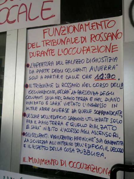Rossano resiste: si passa all’occupazione, adesso non più solo simbolica. Dalle prime ore di questa mattina, le aree all’ingresso del Tribunale di Rossano sono state occupate e non stato è consentito l’accesso ai piani superiori né l’utilizzo degli ascensori. Gli occupanti, presenti al piano terra e al piano rialzato, hanno vigilato per garantire, all’interno del Palazzo di giustizia, il decoro, la sicurezza e il rispetto della cosa pubblica. Durante l’occupazione, l’apertura del Tribunale è avvenuta solo a partire dalle 11,30.