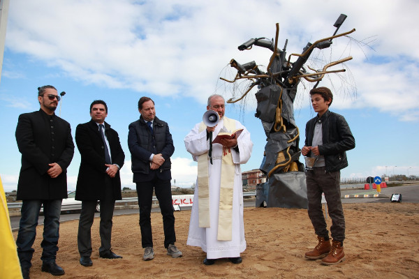 Inaugurazione Golden Faith a Rossano (5)Un albero di ulivo, icona identitaria, culturale, religiosa, economica e sociale di Rossano realizzata con cofani, marmitte e cavi d’acciaio. Del colore dell’oro, che poi è quello dell’olio, prodotto prezioso e antichissimo, linfa vitale. Collocata ad un incrocio per invitare al rispetto dell’ambiente, della natura e del codice della strada, lì a pochi passi dalla SS 106. Si presta a mille interpretazioni l’opera dell’artista Giovanni Daluiso che l’associazione Ricicl’art ha ufficialmente consegnato alla Città domenica. Il taglio del nastro, cerimonia partecipata, è stato operato dal Sindaco Giuseppe Antoniotti, dal Presidente Walter Pulignano e da Don Umberto Sapia che ha impartito la benedizione, offrendo un’ulteriore chiave di interpretazione alla scultura. L’ulivo, simbolo di pace e salvezza. Golden Faith – Fede Dorata. È, questo, il titolo dell’opera dell’artista rossanese. “I sentori del mosto d’olio che aleggiano e si sposano con i profumi del mare – ha spiegato Daluiso – mi hanno invitato e sfidato a rappresentante l’anima di Rossano, non attraverso i ricchi e imponenti reperti della sua storia ultra millenaria, bensì attraverso la sua natura ed i suoi prodotti, la “Dolce di Rossano”, cultivar millenaria di ulivo, specifica del territorio. Cofani d’auto, marmitte, cavi d’acciaio usurati, e altre reliquie di una società governata dalle auto – ha dettagliato – danno vita all’albero che ci àncora alla nostra storia e ci invita al rispetto dell’ambiente. La scultura – ha aggiunto – presenta due colori diversi, dorato e grigio che simboleggiano il piombo che man mano si trasforma in oro, la ricerca alchemica della pietra filosofale, trova in Golden Faith piena espressione artistica”.