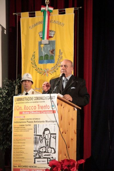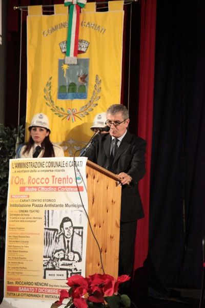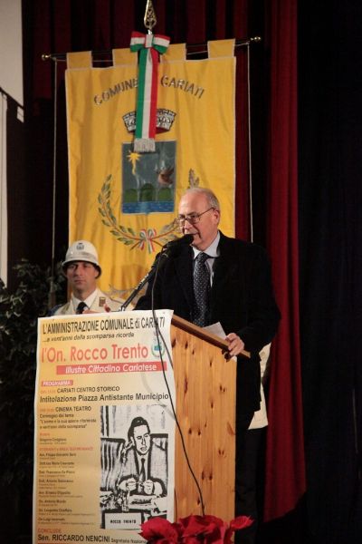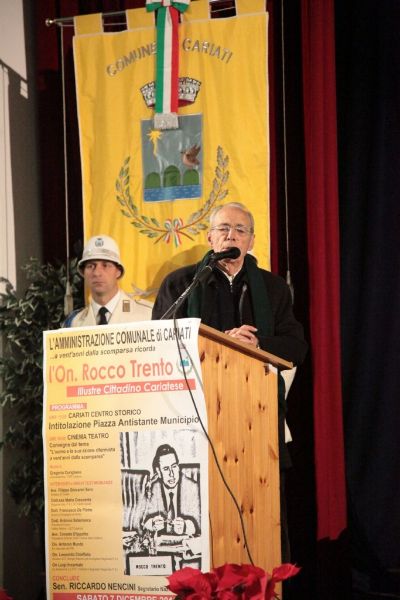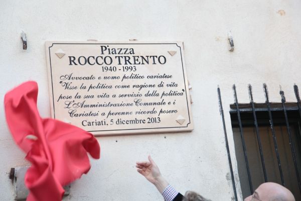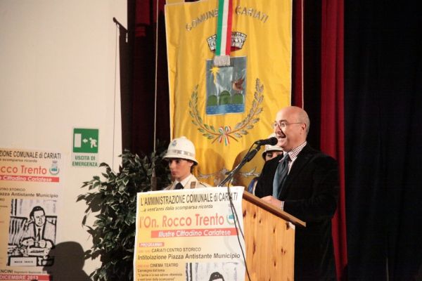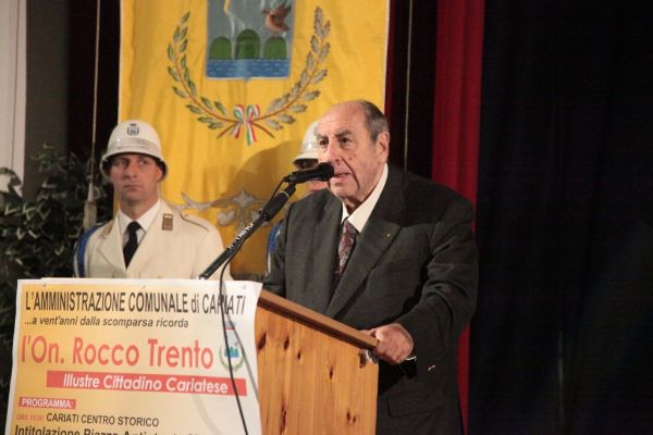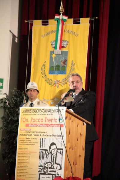 La Calabria è rimasta alle parole pronunciate negli interventi di Rocco Trento in consiglio regionale. È strabiliante l’attualità di quelle sue affermazioni, sugli sprechi e sui poteri occulti nel mondo della sanità calabrese, sul rischio di paranoia istituzionale e di involuzione autoritaria per lo scontro permanente tra poteri dello Stato, sulla magistratura abbandonata e quella dormiente, su mafia e antimafia. Sono parole di oltre 20 anni fa ed è come se fossero state dette per domani mattina. – È, questo, uno dei passaggi più importanti e applauditi dell’intervento conclusivo del Senatore piemontese Enrico Buemi, portando i saluti del segretario nazionale del Partito Socialista Riccardo Nencini, al momento di dibattito sulla figura storica e politica dell’On. Rocco Trento, a venti anni dalla sua scomparsa, ospitato nel Teatro Comunale. Avvocato e uomo politico cariatese, visse la politica come ragione di vita, pose la sua vita a servizio della politica. L’Amministrazione Comunale e i cariatesi a perenne ricordo posero. – E’, questo, il testo scolpito nella targa commemorativa scoperta, facendo scivolare un drappo rosso, nel primo pomeriggio di sabato 7, dal Sindaco di Cariati Filippo Sero insieme alla moglie del compianto On. Trento, la signora Maria Nigro Imperiale e i figli Assunta, Leonardo e Gian Pasquale, nella gremita piazza antistante il Palazzo di Città, nel centro storico e che d’ora in avanti porterà il nome dell’illustre politico e concittadino. – La scelta della dell’agorà – ha detto il Primo Cittadino intervenendo nel Teatro – è emblema della Politica intesa come dimensione ineliminabile dell’Uomo, così come era per Rocco Trento. La sua – ha aggiunto – fu una passione rivoluzionaria, la rivoluzione di un riformista, verso un sistema le cui distorsioni sono ritornate in auge. E la scelta di questa precisa piazza – ha spiegato – è altrettanto emblematica della figura politica di Rocco Trento che volle e seppe rendere la casa comunale la casa di tutti. Il suo messaggio resta per me oggi quello di non avere paura del sistema. Ed è per questo che mi sento grato a lui, pur avendolo conosciuto poco di persona, per avermi indicato la strada. Anche di umili origini, non avrei potuto fare il Sindaco di questa Città senza il messaggio storico dirompente che impersonò Rocco Trento.