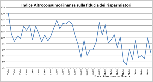 L’indice che descrive le speranze nel futuro dei risparmiatori italiani è sceso a un livello di 87,7 (in area di pessimismo) da quota 100 (assoluta incertezza) in cui si trovava a settembre.