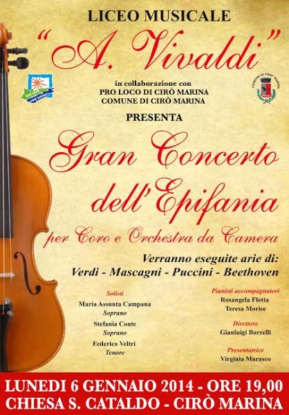 Il Liceo Musicale “A. Vivaldi” di Cirò Marina, in collaborazione con la Pro Loco ed il Comune di Cirò Marina, Vi invitano al Gran Concerto dell’Epifania che si terrà Lunedì 6 Gennaio alle ore 19:00 presso la Parrocchia di S. Cataldo di Cirò Marina. Il Concerto sarà tenuto dal coro polifonico “A. Vivaldi” e da solisti verranno eseguite arie di Verdi, Puccini, Mascagni, Beethoven