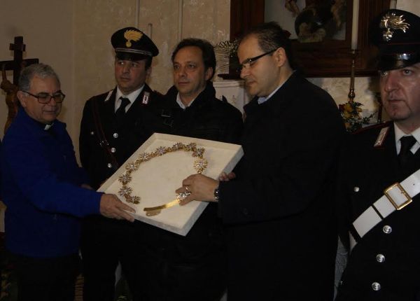 I risultati non tardavano ad arrivare, poiché nel primo pomeriggio di domenica 05 gennaio, a seguito presumibilmente dell’ennesima serie di perquisizioni domiciliari effettuate dai Carabinieri all’alba ( circa venti le abitazioni di pregiudicati del posto perquisite in poche ore da un dispositivo rinforzato di Carabinieri fatto giungere nel Comune di Castelsilano) veniva rinvenuta in una busta il prezioso manufatto in una via centrale del citato Comune: presumibilmente gli autori del sacrilego crimine, per cercar di allentare la pressione delle Forze dell’Ordine, hanno ritenuto opportuno disfarsi dello Stellario, la cui valutazione di assoluta rilevanza si aggira sui 50.000 Euro, il quale tuttavia presentava una rimozione del logo dell’autore, l’orafo Michele Affidato, circostanza questa che fa ritenere che se non ci fosse stato una massiccia e fulminea attività di indagine, l’oggetto sarebbe stato sul punto di essere ricettato e quindi perso probabilmente per sempre.