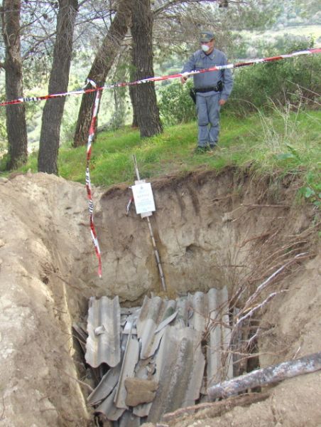 Buca con lastre eternitNell’ambito dei servizi di controllo del territorio a tutela dell’ambiente, il personale del Comando Stazione di Cirò, ha segnalato all’Autorità Giudiziaria numerose violazioni in materia urbanistico-ambientale, denunciando il trasgressore. In particolare, in comune di Casabona in località “Terzo” è stato fermato sul nascere un abuso edilizio dove di recente era stato realizzato un intervento di nuova costruzione consistente in uno scavo di fondazione già completo di riempimento con malta cementizia. L’opera su cui doveva sorgere, verosimilmente, un ricovero attrezzi (mq.90) è stata posta a sequestro preventivo. Poco distante, gli stessi agenti, in una parte di terreno rimboschito con piante di pino D’Aleppo, hanno accertato un altro reato ambientale, ovvero il taglio di 7 piante di notevole diametro ed il successivo sradicamento delle relative ceppaie. Sull’area, di circa mq. 100, ormai disboscata erano stati eseguiti dei lavori di dissodamento del terreno e la messa a dimora di piante da frutto. In sostanza una trasformazione di terreno boscato in altra coltura, intervento vietato per legge in quanto il rimboschimento era stato realizzato con fondi pubblici.