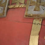 Fase PulituraVi mostriamo in anteprima le foto del restauro della statua di San Cataldo. La delicata operazione è stata affidata alle laboriose e professionali cure dell’artista Elio Malena. La relazione ufficiale dell’artista così reca: “Intagliato in legno dipinto nella seconda metà del 1900 presso i laboratori della famiglia Luigi Santifaller da Ortisei. Si presentava con le superfici scolorite, con abrasioni, crepe e macchie di sporco, come documentato dalle immagini fotografiche. Si è proceduto ad un intervento di pulitura con solventi adeguati: (acqua, alcool, ammoniaca, ecc.).