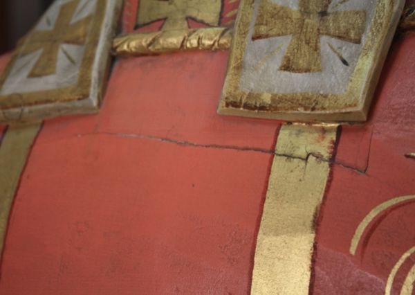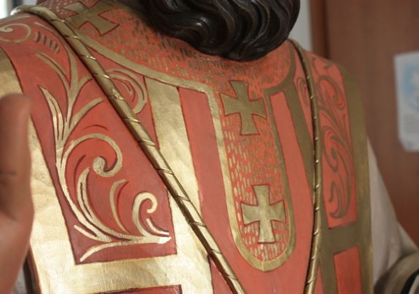 Fase PulituraVi mostriamo in anteprima le foto del restauro della statua di San Cataldo. La delicata operazione è stata affidata alle laboriose e professionali cure dell’artista Elio Malena. La relazione ufficiale dell’artista così reca: “Intagliato in legno dipinto nella seconda metà del 1900 presso i laboratori della famiglia Luigi Santifaller da Ortisei. Si presentava con le superfici scolorite, con abrasioni, crepe e macchie di sporco, come documentato dalle immagini fotografiche. Si è proceduto ad un intervento di pulitura con solventi adeguati: (acqua, alcool, ammoniaca, ecc.).