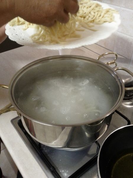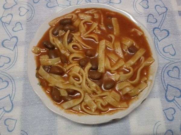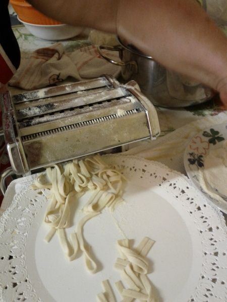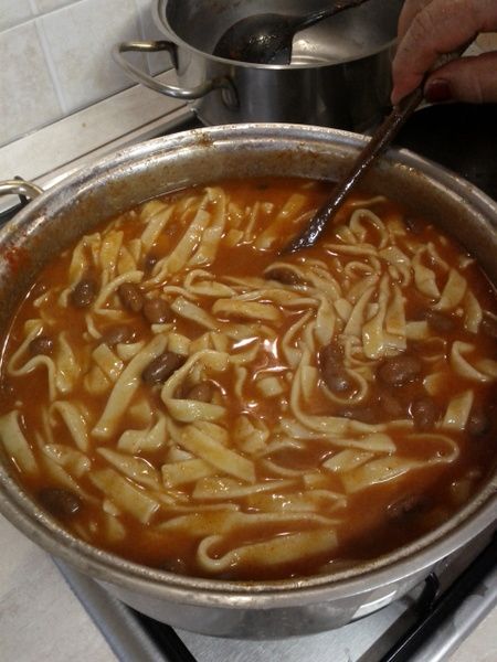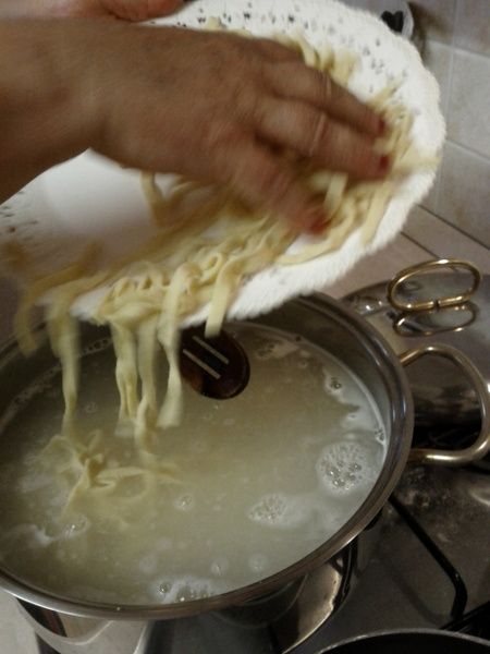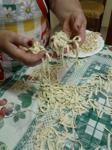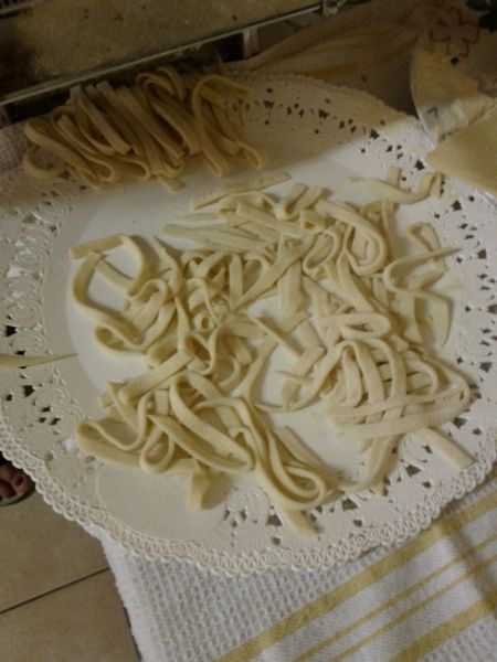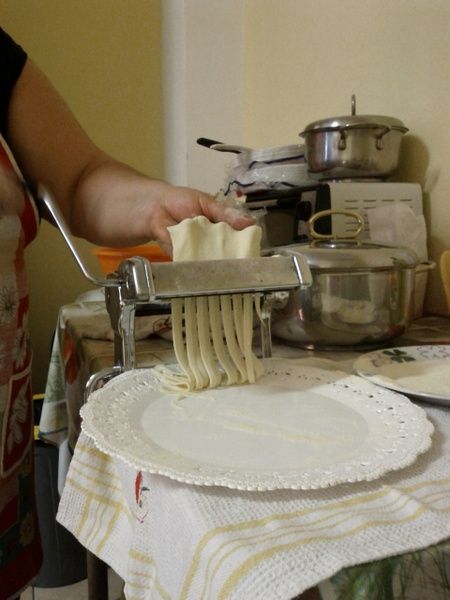 'tajjarini e fagioli' (23)La prima lettrice che ci ha contattato per la nostra rubrica di cucina, fatta con voi e con le vostre ricette è Anna, che ha voluto proporci qualche ricetta della madre, un autentico tornado in cucina. Nell’arco di sole due ore e mezza la signora Vittoria si è prodotta addirittura in tre ricette: un primo, un secondo e un dolce, tutto all’insegna del “come si faceva una volta”. Ve ne proporremo una alla volta, per cui cominceremo oggi con un bel primo robusto e dal gusto antico che sarà la nostra “Ricetta del giorno”: i Tajjarini e fagioli. I tajjarini (una specie di tagliatelle), ovviamente fatti al momento, con le sue mani, impastando su una spianatoia un chilo di farina e mezzo litro d’acqua.