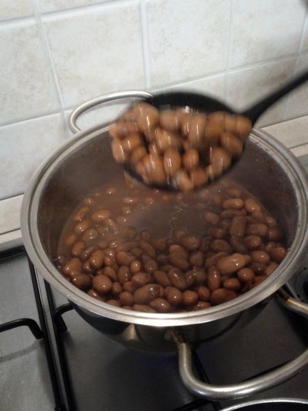 Procedimento per cuocere i fagioli: togliere i fagioli dal baccello e sciacquarli per bene sotto l’acqua corrente. Scolarli e versarli nella pentola di acqua fredda insieme al sedano sminuzzato facendoli cuocere per un’ ora abbondante e aggiungendo acqua tiepida man mano che si asciugano. Quasi a fine cottura aggiungere il sale.
