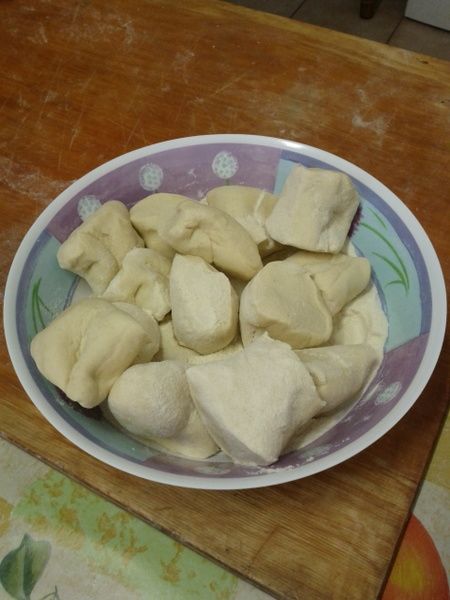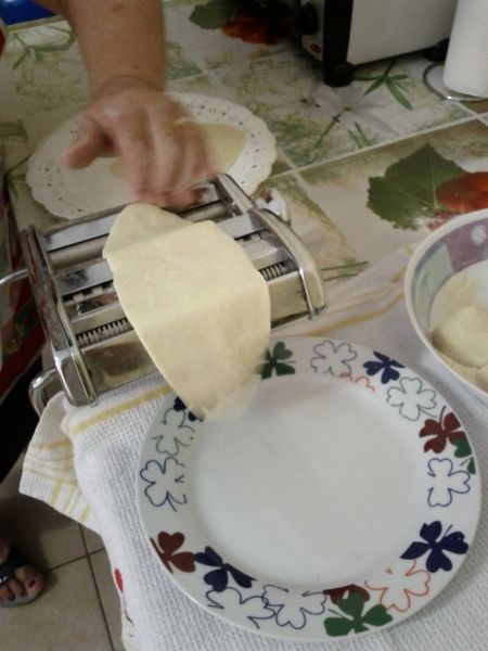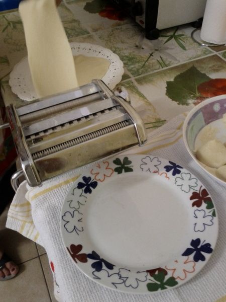 Su una spianatoia disporre la farina a fontana e versare a filo l’acqua a temperatura ambiente lavorando la pasta fino ad assorbimento dell’acqua. Procedere nella lavorazione dell’impasto fino a quando diventa liscio ed omogeneo e lasciarlo a riposare un pochino. Suddividerlo a tocchi tagliando la pasta con un coltello e mettere i pezzi di impasto in una ciotola infarinata, come in foto, cosicché non attaccheranno alla macchina della pasta. Passare ogni pezzetto di impasto infarinato nella macchina per schiacciarlo e creare delle lamine sottili che andranno stese su una tovaglia ad asciugare leggermente, fino a terminare tutto l’impasto.