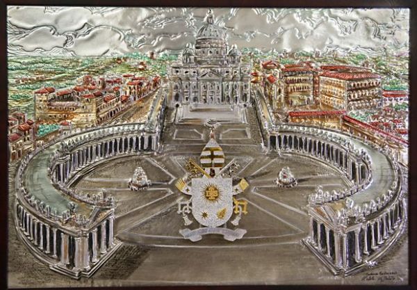 Un bassorilievo in argento che riproduce Piazza San Pietro con tutto il colonnato del Bernini dipinto con smalti a fuoco e lo stemma papale sempre in argento rappresentato da uno scudo tra due chiavi sormontato dai simboli della dignità pontificia. Lo stemma è circondato da raffigurazioni a rilievo, che indicano tre elementi molto importanti della vita spirituale del Pontefice. In alto, campeggia l’emblema dell’ordine di provenienza del Papa, la Compagnia di Gesù: un sole raggiante e fiammeggiante caricato dalle lettere IHS, monogramma di Cristo. La lettera H è sormontata da una croce, mentre nella parte sottostante sono stati raffigurati tre chiodi. In basso, si trovano la stella e il fiore di nardo. La prima, secondo l’antica tradizione araldica, simboleggia la Vergine Maria, madre di Cristo e della Chiesa; il fiore di nardo indica San Giuseppe, patrono della Chiesa universale. Ponendo nel suo scudo tali immagini, il Papa ha inteso esprimere la propria particolare devozione verso la Vergine Santissima e San Giuseppe. Sullo stemma pontificio è riportato anche il motto scelto da Francesco quando fu eletto Vescovo: l’espressione di San Beda “miserando atque eligendo”. Lo stemma realizzato dal maestro Michele Affidato è collocato al centro del bassorilievo raffigurante Piazza San Pietro culla della cristianità, ma essendo lo stesso estraibile e decorativo, potrà anche essere utilizzato dal Santo Padre come razionale (fermaglio da piviale).