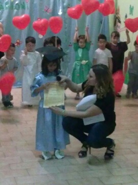 Emozionante è stato anche il momento finale dedicato all‘unica bambina uscente, Andreea Giulia Cernat alla quale è stato consegnato il diploma di merito fra gli applausi e le emozioni. La maestra Francesca De Fine gli ha dedicato un discorso che ha commosso tutti per l’alto contenuto sociale ed affettivo. Bellissimo il finale sulle note de” Il cerchio della vita”, dove i piccoli hanno salutato la loro amichetta dedicandogli una breve poesia, circondata in un girotondo di amichetti, si è poi concluso con un grande abbraccio affettuoso. Infine la dirigente scolastica, Filomena Cozza, nel suo intervento, ha ringraziato tutti, a partire dai genitori per la collaborazione prestata, e per il lavoro svolto sia dalle educatrici che dai piccoli, ritenendosi soddisfatta per il bel lavoro svolto durante l’anno scolastico. Al termine della recita i piccoli si sono divertiti e hanno festeggiato insieme ai loro genitori e maestre, nella villetta situata vicino alla scuola , dove è stato servito un ricco buffet.
