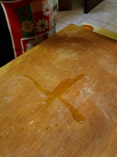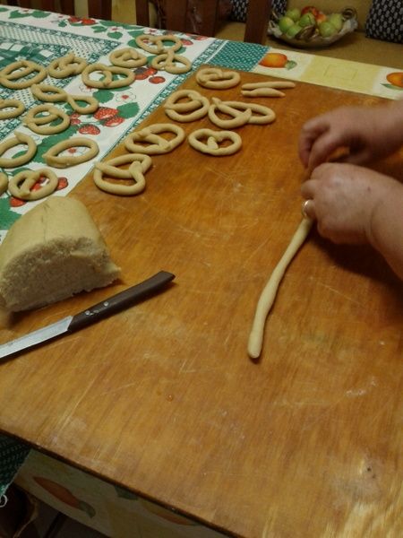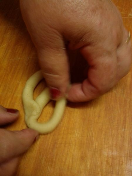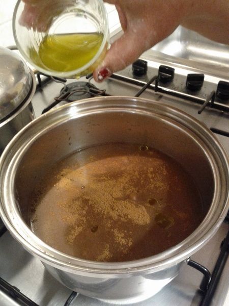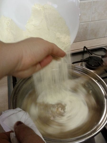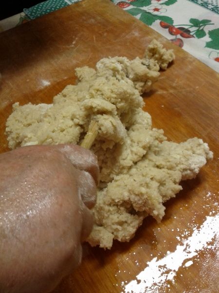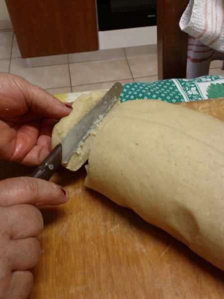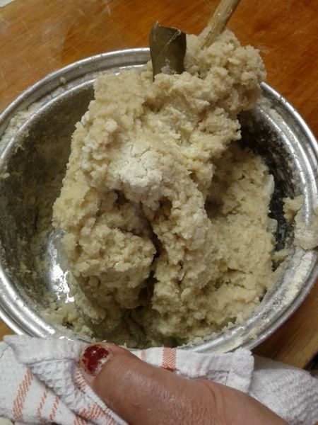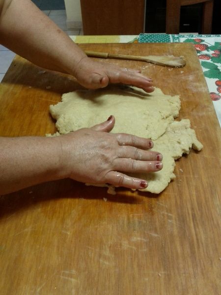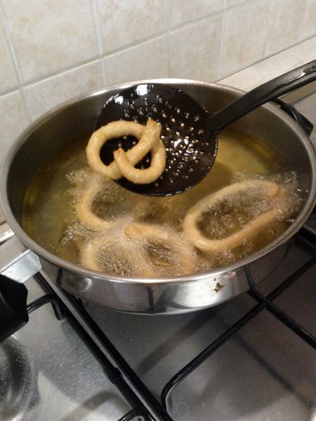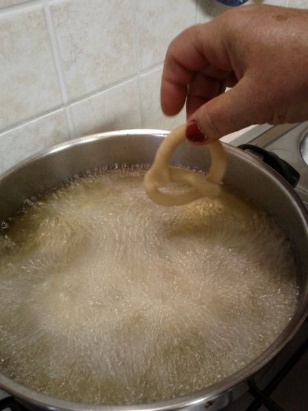 Riempire una pentola con il litro di acqua e versare un’abbondante spolverata di cannella. Aggiungere il pizzico di sale seguendo il segno di una croce.Versare il mezzo bicchiere di olio a filo sempre seguendo il segno di una croce e disporre sulla superficie dell’acqua le due foglie di alloro spezzate in quattro parti a forma di croce. Quando l’acqua comincia leggermente a sobollire (non deve bollire) versare molto gradualmente la farina mescolando continuamente con un cucchiaio di legno (la signora Vittoria durante questa fase ripeteva continuamente: “ventu ventu cannedda cannedda”) perchè questa è la fase più difficile e decisiva in quanto l’impasto deve assumere la consistenza giusta altrimenti le frittelle non riescono.