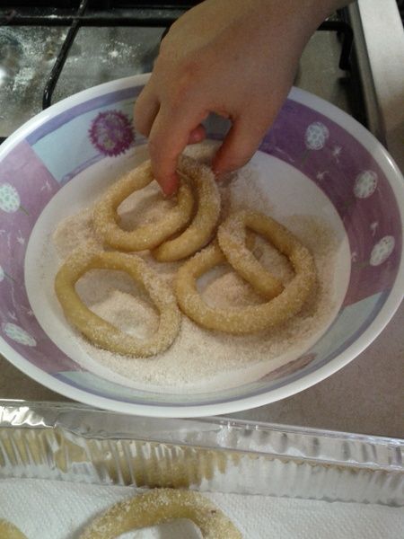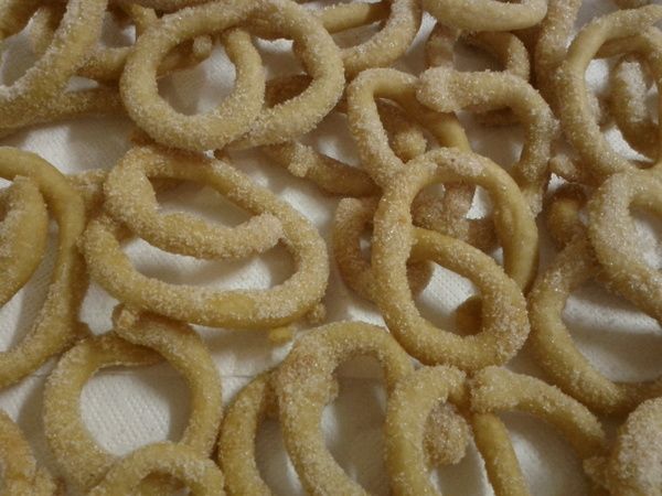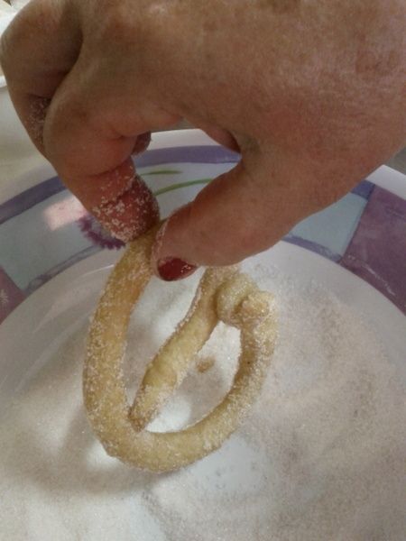 Dopo aver mescolato bene l’impasto trasferirlo su una spianatoia dove si sarà versato un filo d’olio creando il segno di una croce. Togliere i quattro pezzi di alloro. Sbattere l’impasto ripetutamente e con molta forza sulla spianatoia, lavorandolo con le mani fino a quando non risulta sodo, liscio ed elastico al punto giusto altrimenti non si riuscirà a dare la forma alle frittelle e durante la frittura si scioglieranno (disastro!). Staccare un pezzo di impasto alla volta e lavorarlo ancora sulla spianatoia dandogli una forma sottile ed allungata da cui ricavare i girelli che formeranno le crespelle immergendoli un po’ alla volta in una pentola di olio di semi bollente. Dopo un minuto circa (devono rimanere chiare) saranno cotte, quindi con un mestolo forato trasferirle in un vassoio con dei fogli di carta assorbente per asciugarle dall’olio. Tuffarle in una capiente ciotola piena di zucchero e cannella girandole e rigirandole affinchè si ricoprano bene. Gustatele subito mentre sono calde e sprigionano tutto il loro aroma e grazie alla signora Vittoria che ci ha svelato il segreto delle sue irresistibili crespelle.