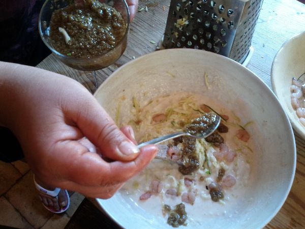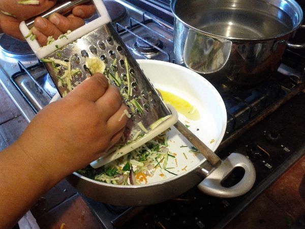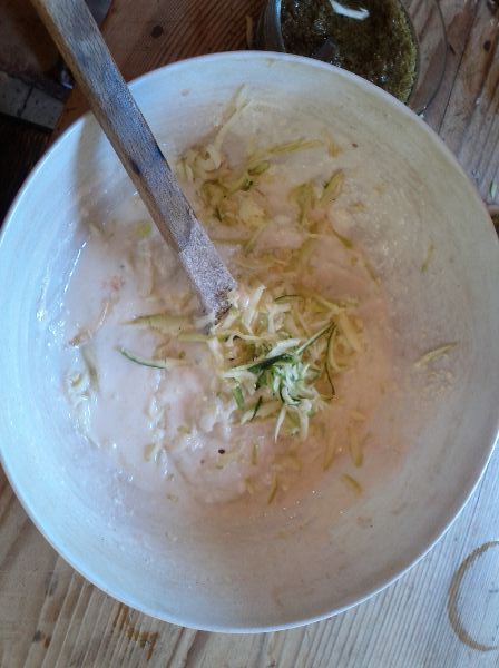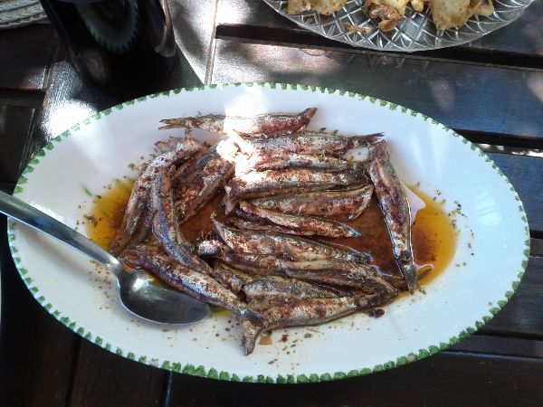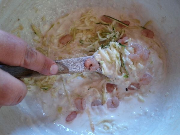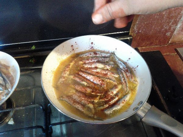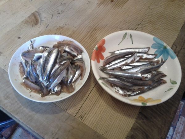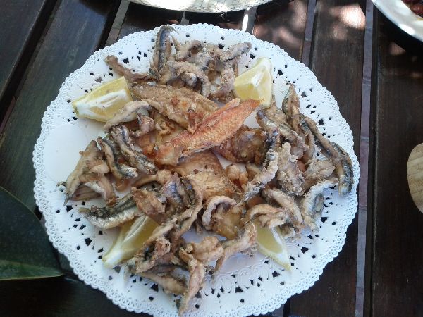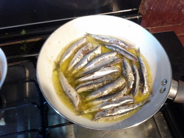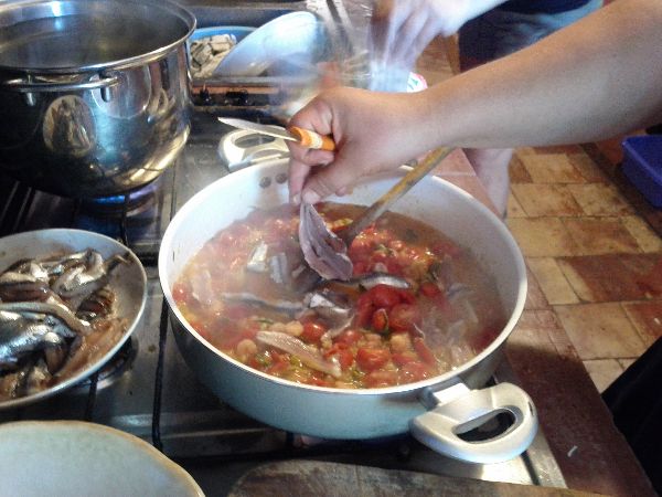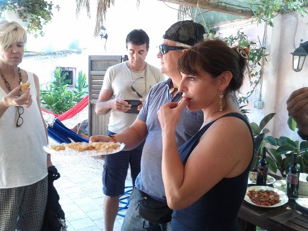 Pipi e Surici (2)Oggi Elena ha preparato oltre al primo con gli spaghetti, che descriveremo, “pipi e surici” (peperoni e pesce pettine) fritti, melanzane ripiene, frittura di “alici e surici” infarinate, “alici scattiate” con aceto e pepe rosso, ed una vera chicca, le frittelle con zucchine, gamberetti e, colpo di genio, il “majo” (fiori di sambuco), conservati nell’olio e quindi disponibili tutto l’anno. Si prepara la pastella con acqua, farina e sale e si aggiungono gamberetti, zucchina grattugiata ed i fiori di majo all’olio (qualche cucchiaino). Si mescola bene ed a cucchiaiate si versa un po’ di impasto alla volta nell’olio di semi bollente fino a che le frittelle imbiondiscono. Squisitissime. Una pastella asciutta, croccante e leggera. Non siamo però in grado di fornirvi alcun dosaggio perchè Elena, che farebbe la fortuna di ogni ristorante, precisa subito: “non chiedetemi le dosi per favore, che io vado ad occhio ed a intuito, non ho mai misurato niente”. Ed a proposito di menù vi posso assicurare che il numero delle portate di oggi è notevolmente inferiore allo standard consueto in quanto i presenti avevano espresso il desiderio di restare un po’ leggeri. Sono quasi le due di pomeriggio, il padrone di casa rientra con alcuni ospiti, tra cui una coppia piemontese, lui enologo, lei imprenditrice nel ramo immobiliare ed alta moda, reduci da un giro per vigneti, campagne e scorci panoramici vari, tutto apprezzatissimo. E’ ora di sedersi alla bellissima tavola allestita e decorata con eleganza da Ilaria e gustare finalmente le specialità di Elena. Dopo aver assaggiato la pasta ve la saprò descrivere meglio.