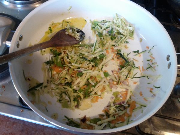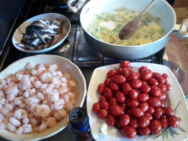 Preparare in una larga teglia un fondo di olio abbondante, cipolla tritata ed aglio da fare soffriggere delicatamente insieme alla zucchina ed alla carota grattuggiate. Aggiungere i gamberetti e continuare a soffriggere sfumando con il vino bianco. Dopo incorporare i pomodorini, piccoli e saporiti, ed il sale continuando la cottura per una decina di minuti. Aggiungere le alici pulite, disiliscate ed aperte a libro. Devono essere freschissime, con il sapore del mare dentro. Aggiungere qualche fogliolina di basilico ed un po’ di pepe nero macinato e dopo pochi minuti spegnere la cottura. Cuocere gli spaghetti molto al dente, scolarli e versarli nella teglia del condimento. Girarli per bene e passarli in una teglia rotonda foderata di alluminio per una breve passata in forno al cartoccio (cinque minuti). Prima di chiuderli nell’alluminio aggiungere un filo di olio crudo, qualche altro pomodorino tagliato a metà, una spolverata di pepe nero ed abbondante prezzemolo tritato. Toglierli dal forno, e trasferirli, senza l’alluminio in un capiente piatto da portare a tavola.
