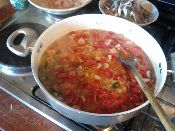 Spaghetti di Elena (10)Ringraziamo innanzitutto il padrone di casa Giuseppe Ippolito (Seppetto per gli innumerevoli amici) per la sua enorme disponibilità ed ospitalità, conosciuta ed apprezzata da tutti quelli che hanno la fortuna di frequentare casa sua e ringraziamo Elena, una meravigliosa giovane signora che è la preziosa ed insostituibile cuoca di casa Ippolito. Elena si muove rapidissima e sicura, inventando ogni giorno nuove ricette a seconda di quello che trova in cucina, dove non mancano mai, specialmente in estate, i pomodorini con cui si cucina e si prepara il sugo, i peperoni, le melanzane, le zucchine, la cipolla di Tropea, l’aglio locale a treccia, basilico fresco, prezzemolo, sedano e pesce freschissimo, non importa quale, basta che sia fresco perchè è cosi’ che si mangia a casa Ippolito, prodotti del territorio e di stagione, genuini ed a chilometro zero (tranne i gamberetti). E quando i numerosi ospiti di casa cioè amici vari, importatori di vino, enologi, provenienti da ogni parte del mondo incontrano questi sapori, cadono tutti, conquistati e vinti, senza opporre alcuna resistenza a tutto quello che arriva in tavola, abbondantemente annaffiato da vino rosso, Gaglioppo doc, autentica espressione del vero vino Cirò.