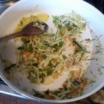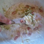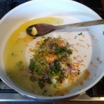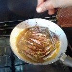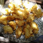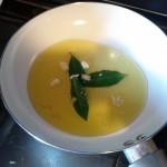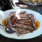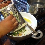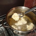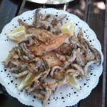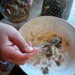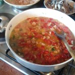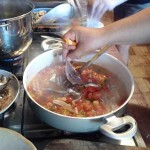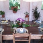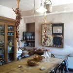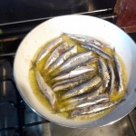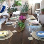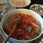 Oggi Elena ha preparato oltre al primo con gli spaghetti, che descriveremo, “pipi e surici” (peperoni e pesce pettine) fritti, melanzane ripiene, frittura di “alici e surici” infarinate, “alici scattiate” con aceto e pepe rosso, ed una vera chicca, le frittelle con zucchine, gamberetti e, colpo di genio, il “majo” (fiori di sambuco), conservati nell’olio e quindi disponibili tutto l’anno. Si prepara la pastella con acqua, farina e sale e si aggiungono gamberetti, zucchina grattugiata ed i fiori di majo all’olio (qualche cucchiaino). Si mescola bene ed a cucchiaiate si versa un po’ di impasto alla volta nell’olio di semi bollente fino a che le frittelle imbiondiscono. Squisitissime. Una pastella asciutta, croccante e leggera. Non siamo però in grado di fornirvi alcun dosaggio perchè Elena, che farebbe la fortuna di ogni ristorante, precisa subito: “non chiedetemi le dosi per favore, che io vado ad occhio ed a intuito, non ho mai misurato niente”. Ed a proposito di menù vi posso assicurare che il numero delle portate di oggi è notevolmente inferiore allo standard consueto in quanto i presenti avevano espresso il desiderio di restare un po’ leggeri. Sono quasi le due di pomeriggio, il padrone di casa rientra con alcuni ospiti, tra cui una coppia piemontese, lui enologo, lei imprenditrice nel ramo immobiliare ed alta moda, reduci da un giro per vigneti, campagne e scorci panoramici vari, tutto apprezzatissimo. E’ ora di sedersi alla bellissima tavola allestita e decorata con eleganza da Ilaria e gustare finalmente le specialità di Elena. Dopo aver assaggiato la pasta ve la saprò descrivere meglio.